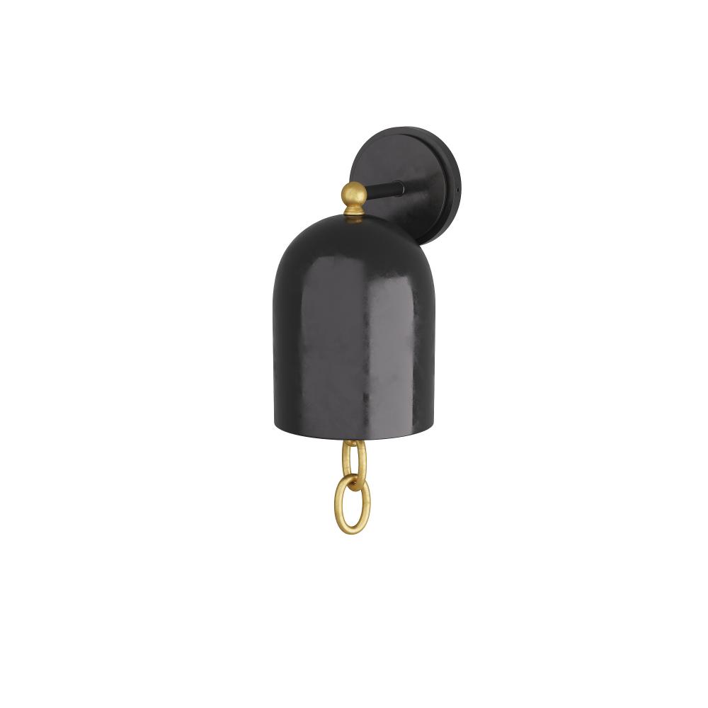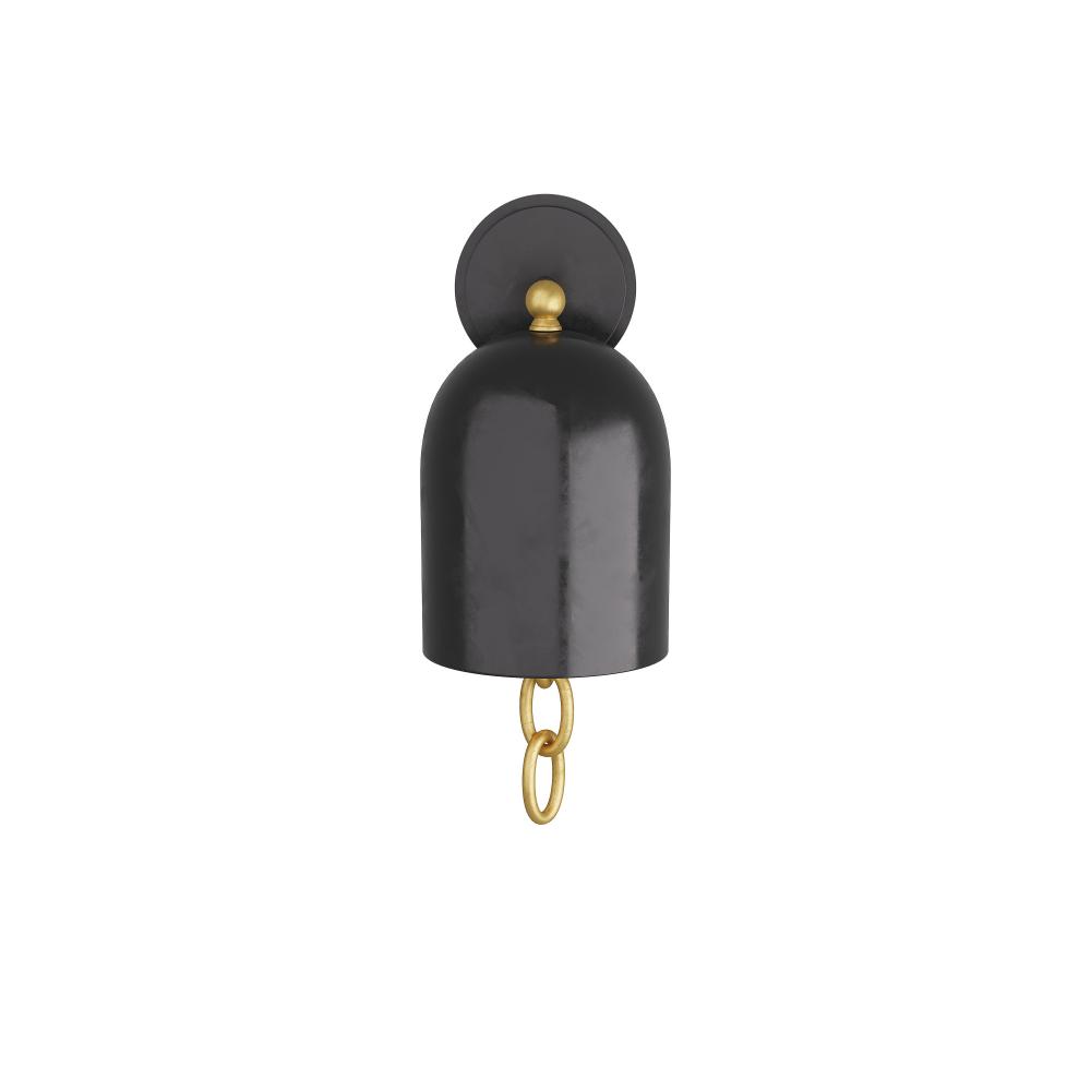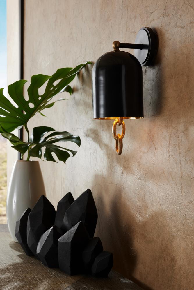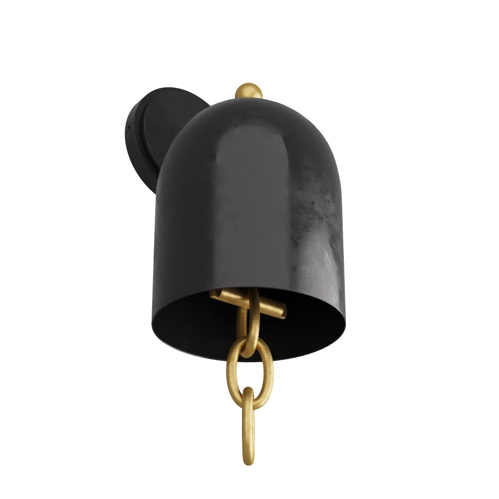 An updated a classic bell-shaped sconce with the surprise of a jewelry-inspired accent. A highly polished chain of brass rings adds the perfect amount of contrast to the bronze finished iron shade, arm and backplate. Damp-rated, although limited covered outdoor conditions may affect finish. Finish will vary.