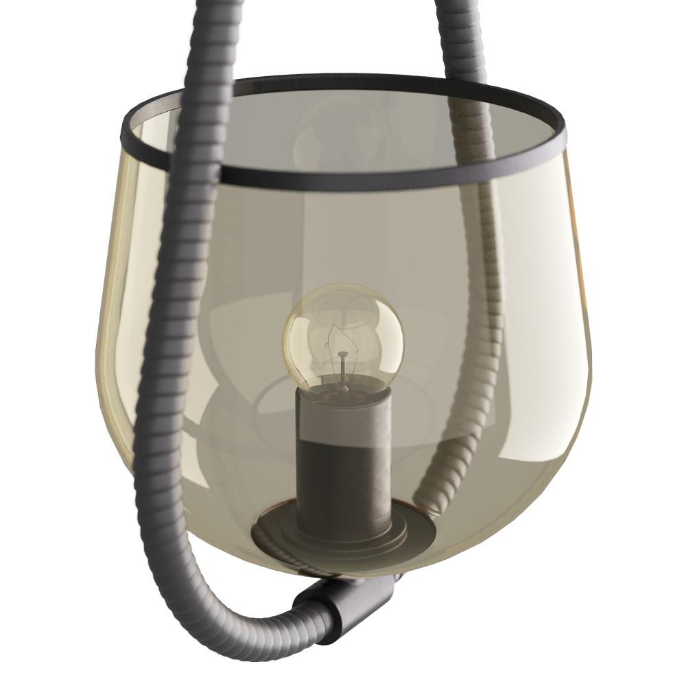 A traditional equestrian stirrup influenced a clever twist on the pendant. Wrapped in graphite leather, its English bronze iron finished post cradles a bowl of smoke glass trimmed with a matching English bronze stripe. Damp-rated, although limited covered outdoor conditions may affect finish. Finish will vary.