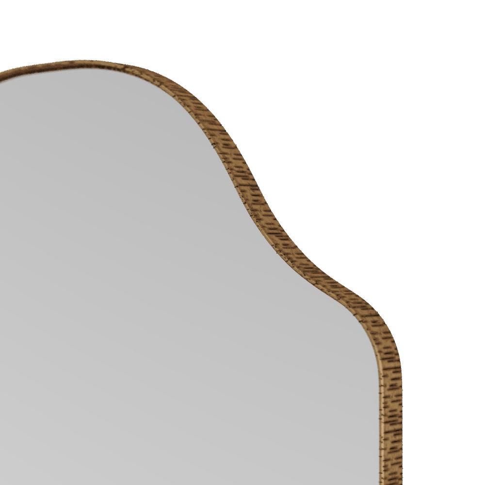 The portal shape of a classic arched mirror finds a minimalist update in Ayers. Delicately framed in chattered iron finished antique brass for extra impact. Designed to be hung vertically, it is fitted with security cleat hardware. Finish will vary.