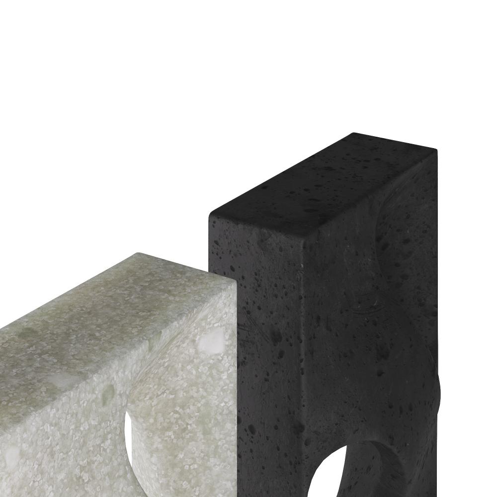 This set of dual loop bookends is designed as a play on positive and negative space. An elegant accessory for any surface, this charcoal ricestone composite and ivory glass stone composite set recalls modernist sculpture. Finish will vary.