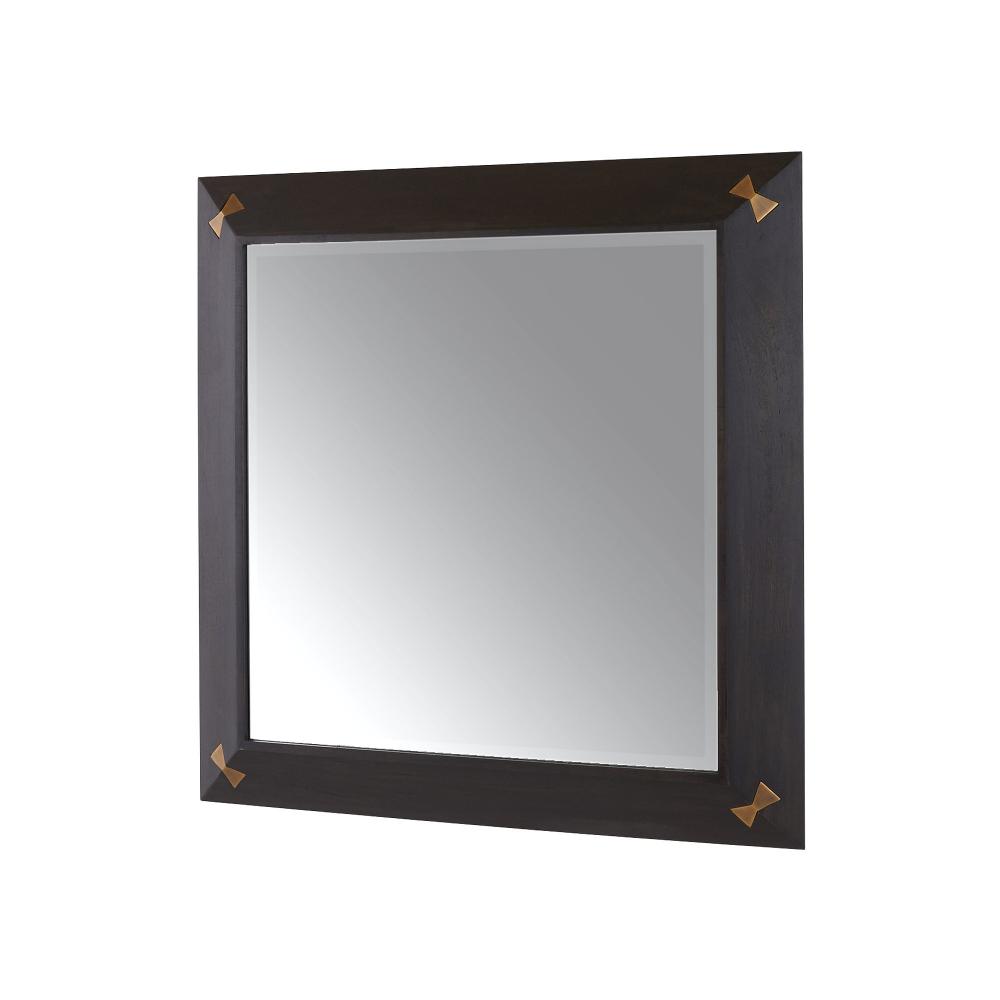 A polished sable mango wood frame is adorned with inlaid butterflies of antique brass to catch the light. The beveled mirror is held securely with dovetail joints, while each hinge lies flush within the frame for a smooth finish. Designed to be hung vertically, it is secured with a cleat at the back. Finish will vary.