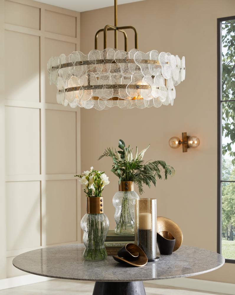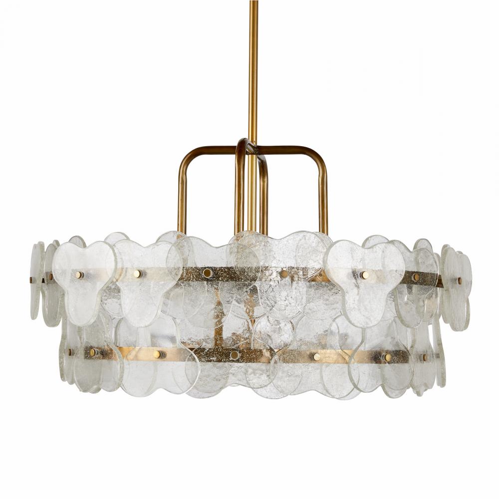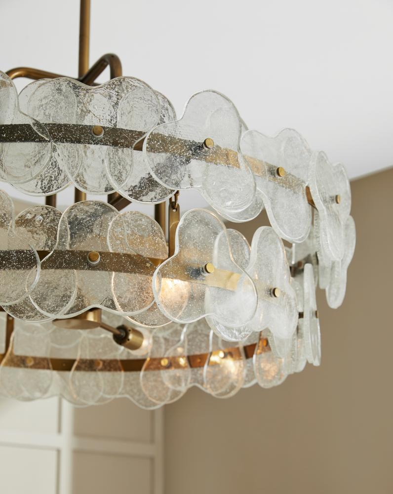 Inspired by the natural flow of water, clear seedy glass florets layer and overlap like a luxe puzzle. Anchored to a double drum frame of antique brass steel, their glow is refracted and reflected to deliver the feeling of movement.
