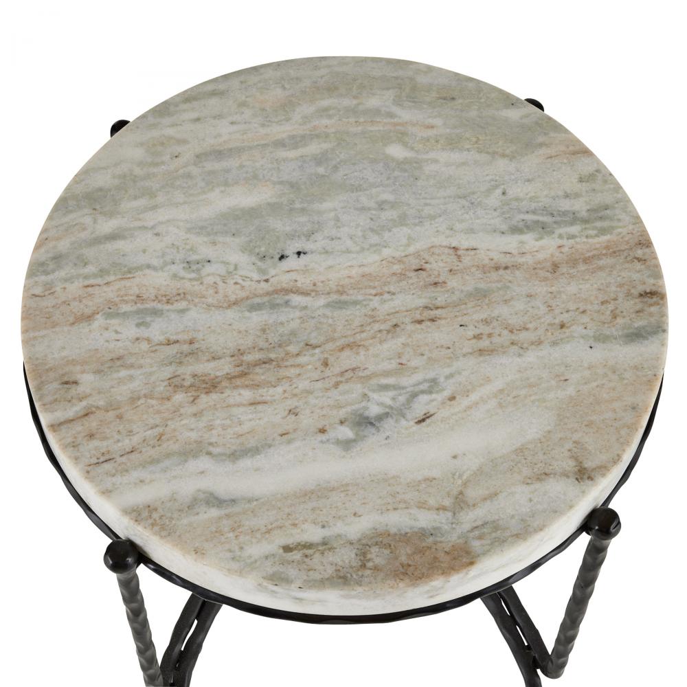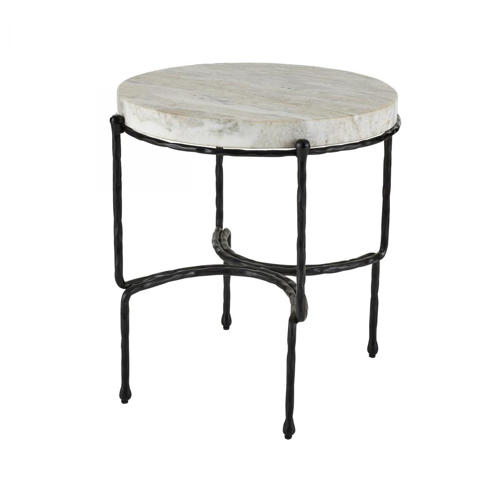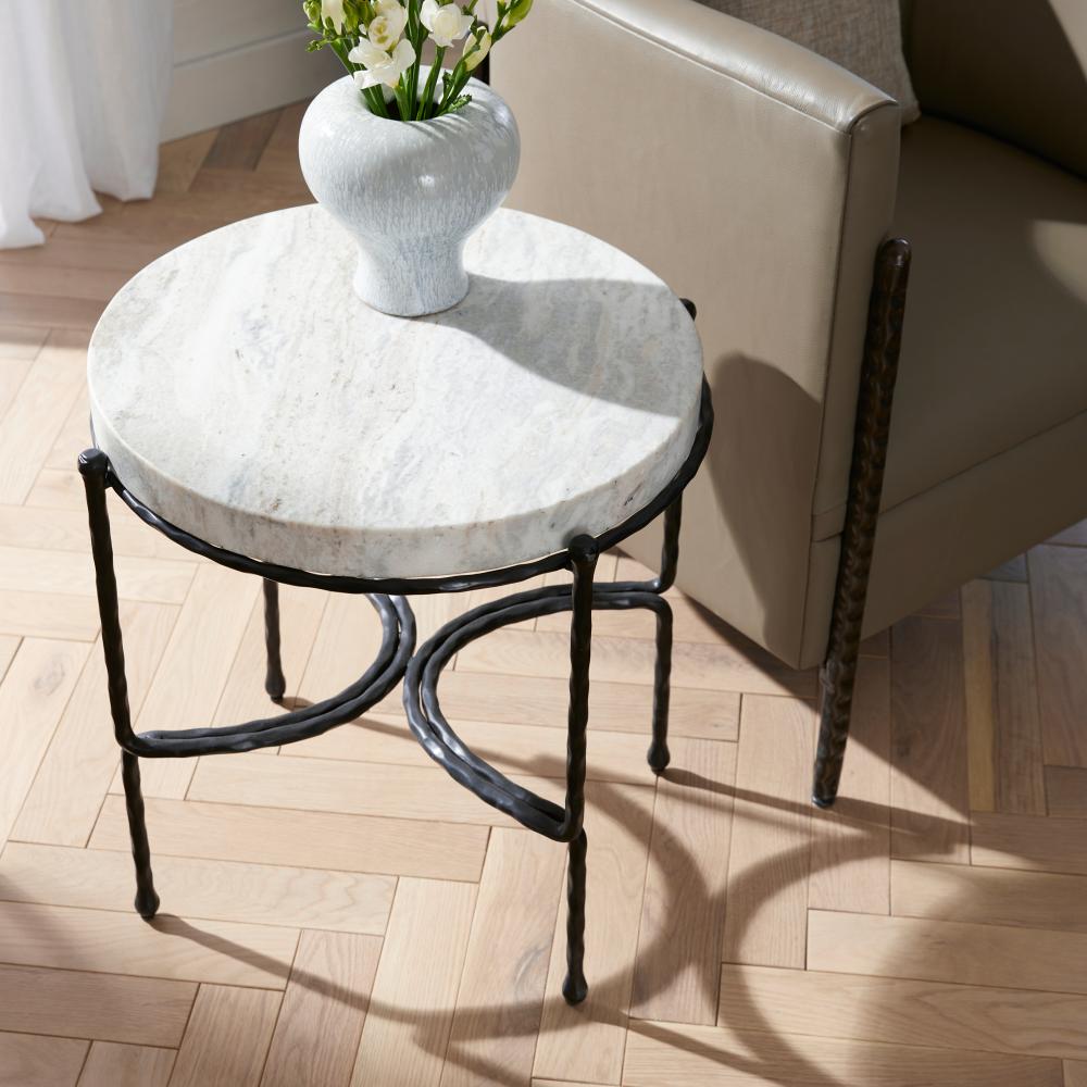 All intersecting lines and flowing forms, the Cedric is a nod to a traditional silhouette updated in fresh materials. A hammered u-shaped base of blackened iron juxtaposes an over-scaled toronto leathered marble top. Finish will vary.