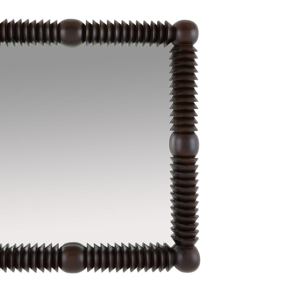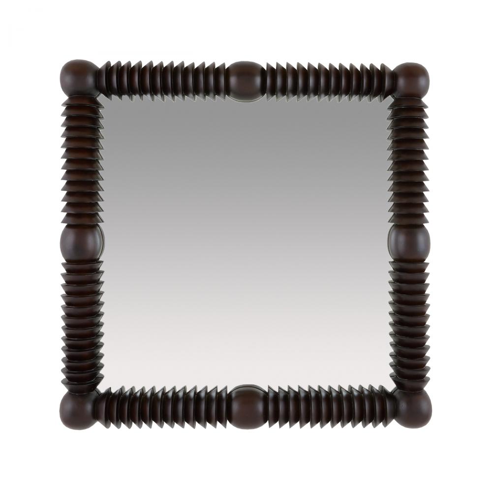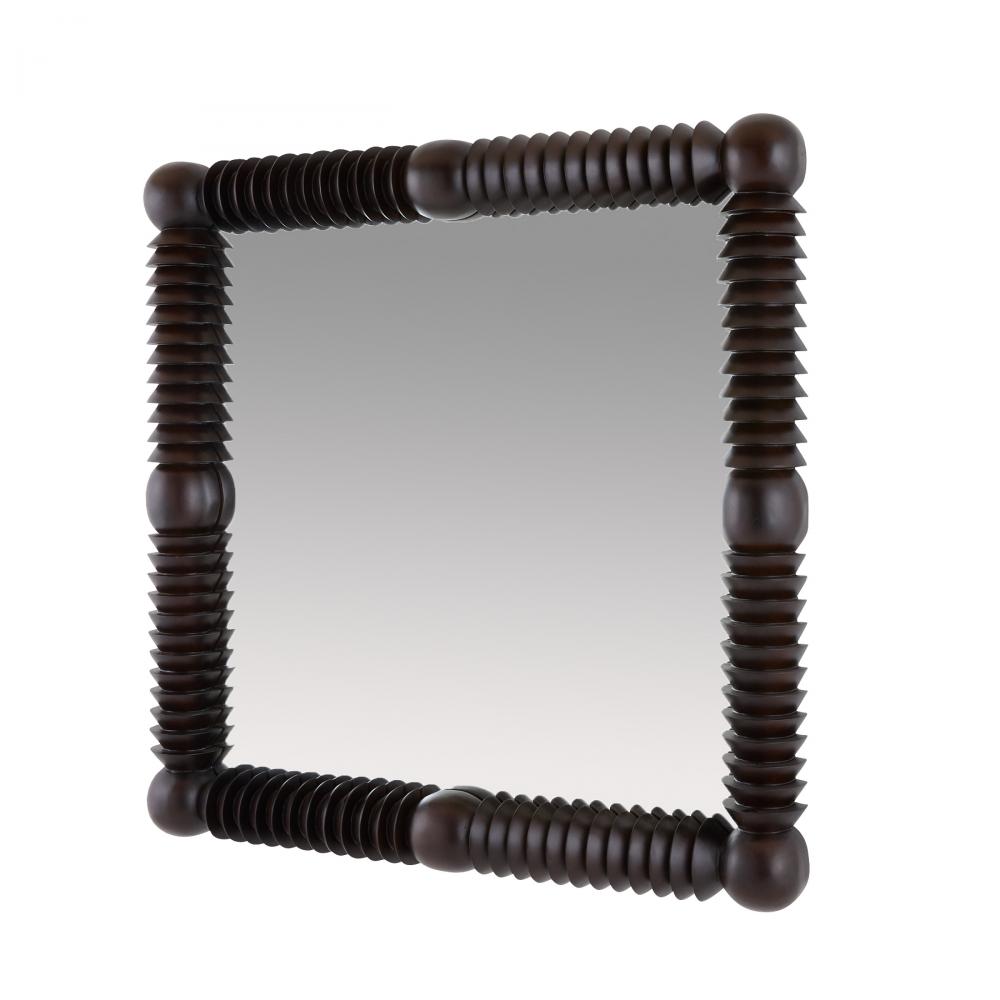 This shingled style has a curated aesthetic reminiscent of the arts and crafts movement. Intricately carved of umber mango wood with circular accents, the rippling frame supports a square mirror that can be hung vertically or horizontally. A cleat attachment assures secure display. Finish will vary.