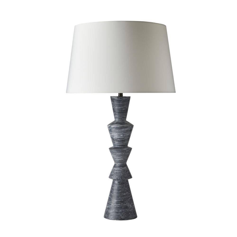 Crafted from our new faux galaxy marble, the sculptural shape of this slender resin lamp is inspired by turned wooden spindles. The totemic form’s smaller footprint allows it for placement in tighter spaces or display it in pairs. Bronze harp and matching finial. Off-white microfiber drum shade. Finish will vary.
