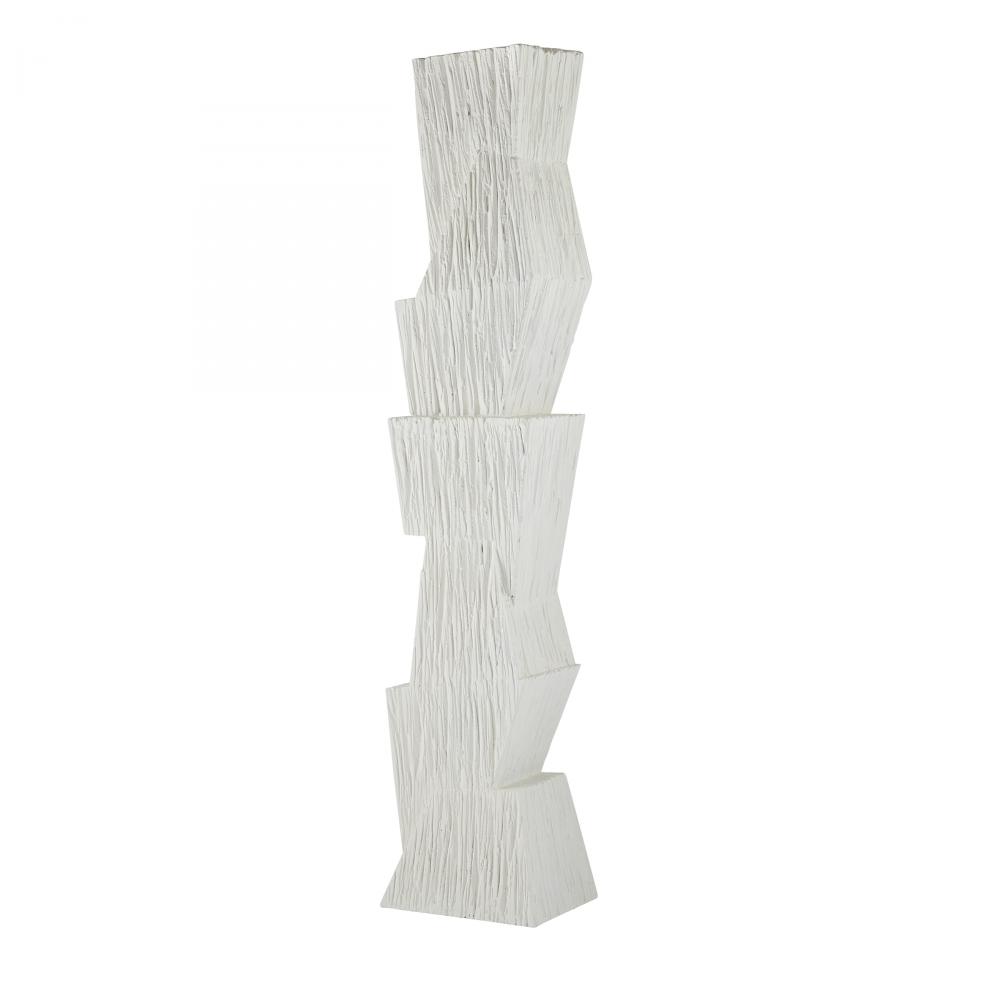 A totem of matte white resin is a commanding accent piece for any corner of the room. Designed to draw the eye to its geometric form, a faux wood finish adds a dynamic accent to the texture on its vertical surface. Finish will vary.
