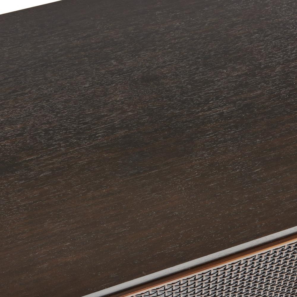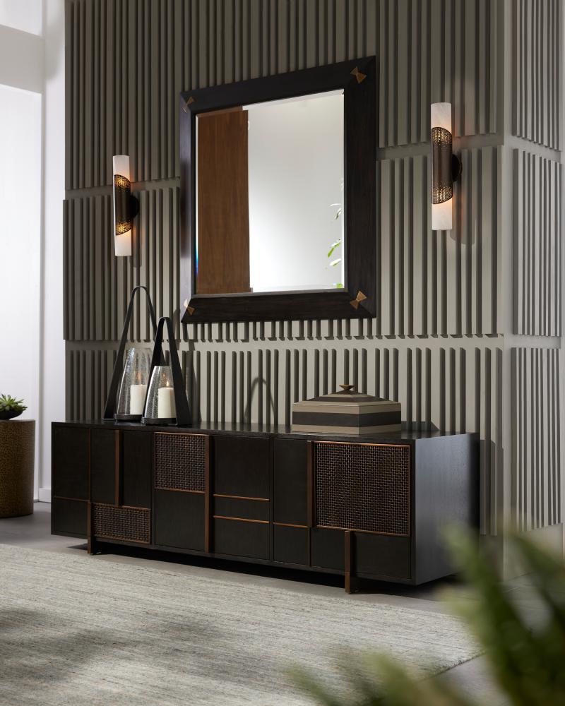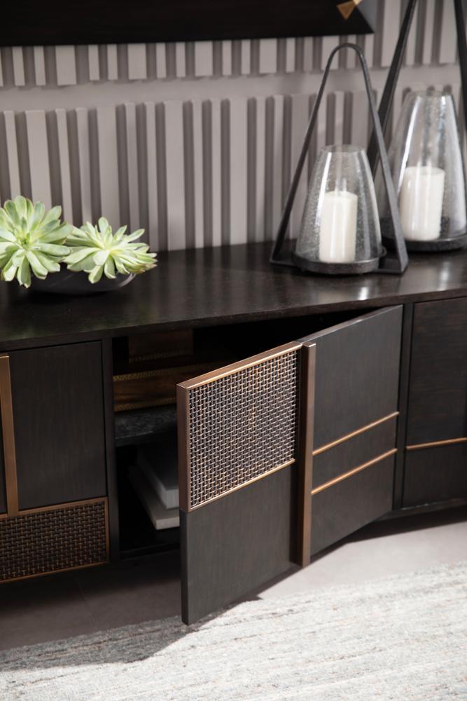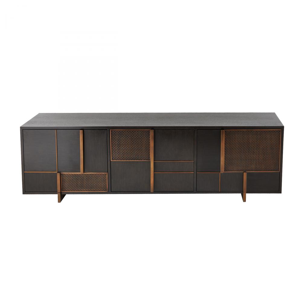 Inspired by the compositions of Piet Mondrian, the delicate linework of this media cabinet makes it a functional work of art. A patchwork pattern of brindle eucalyptus and ebony walnut veneer is enhanced with lines and grids of antique brass iron design. The interior is fitted with adjustable shelving in ebony oak veneer. Finish will vary.