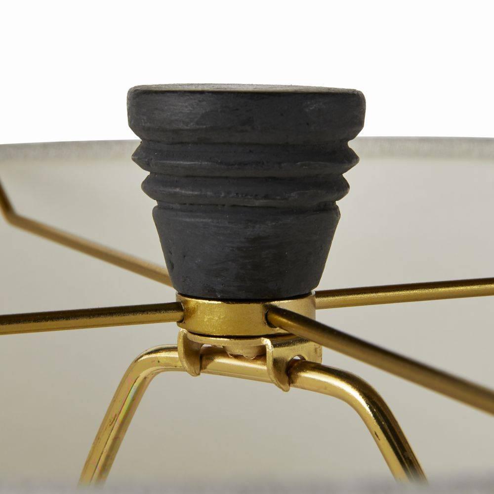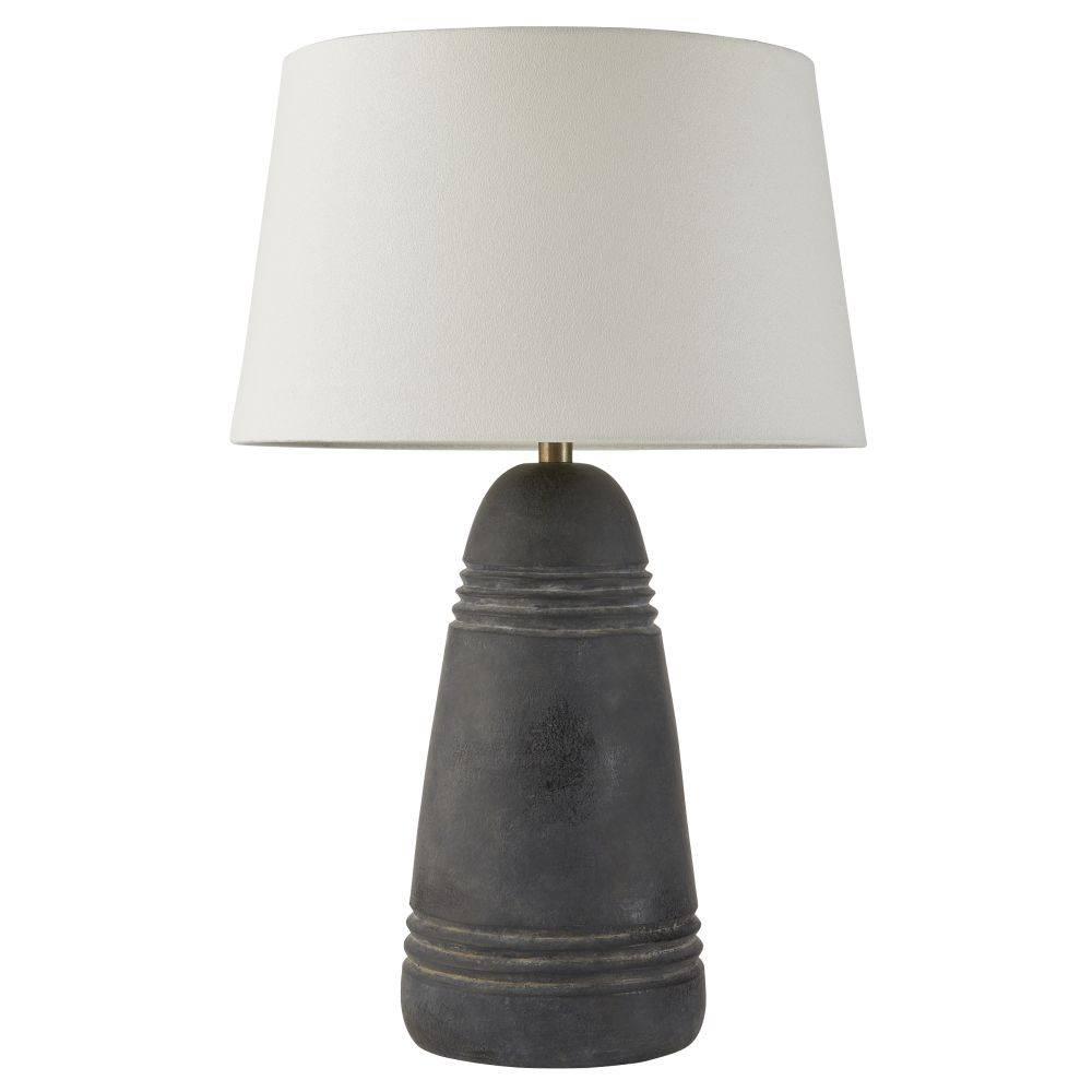 Made for an organic modern space, the Django’s monolithic form adds a bold contrast in a neutral room. A matte charcoal terracotta base is carefully gauged with groove-like details at its top and base. Crowned with an off-white linen drum shade, this minimalist accessory also features antique brass hardware and a matching finial. Finish will vary.