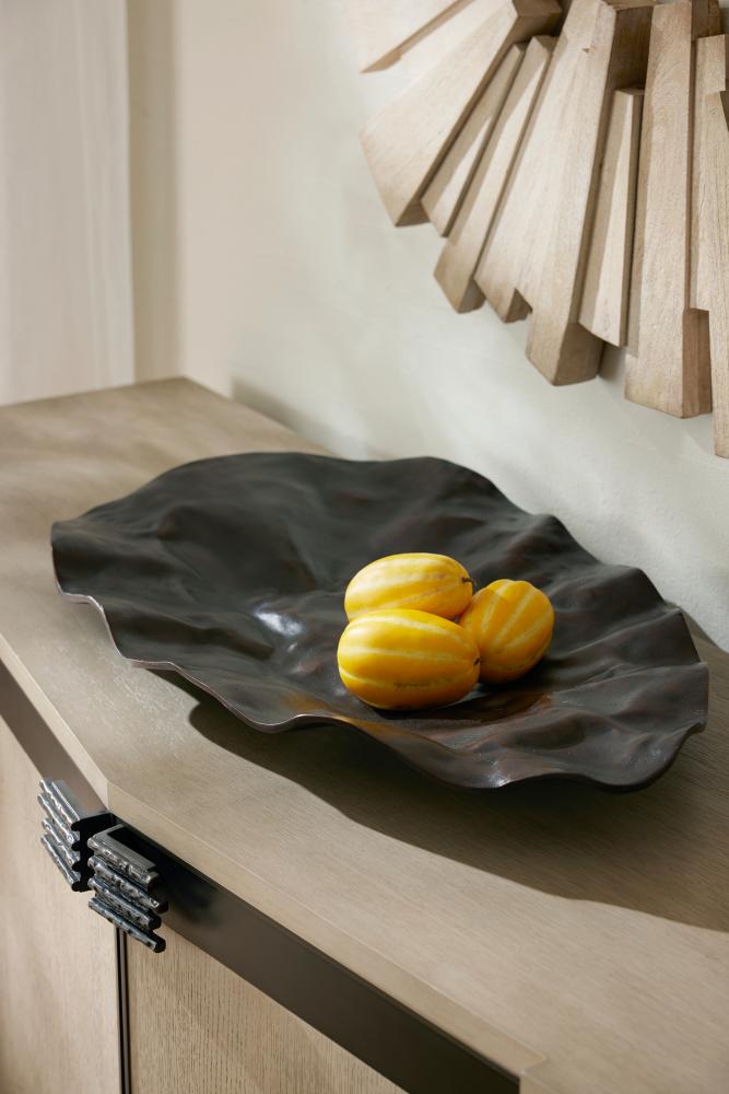 With a freeform hammered texture, this unique cast aluminum centerpiece resembles a crushed shield. Oversized to add drama, the antique copper surface delivers textural appeal. Finish will vary.