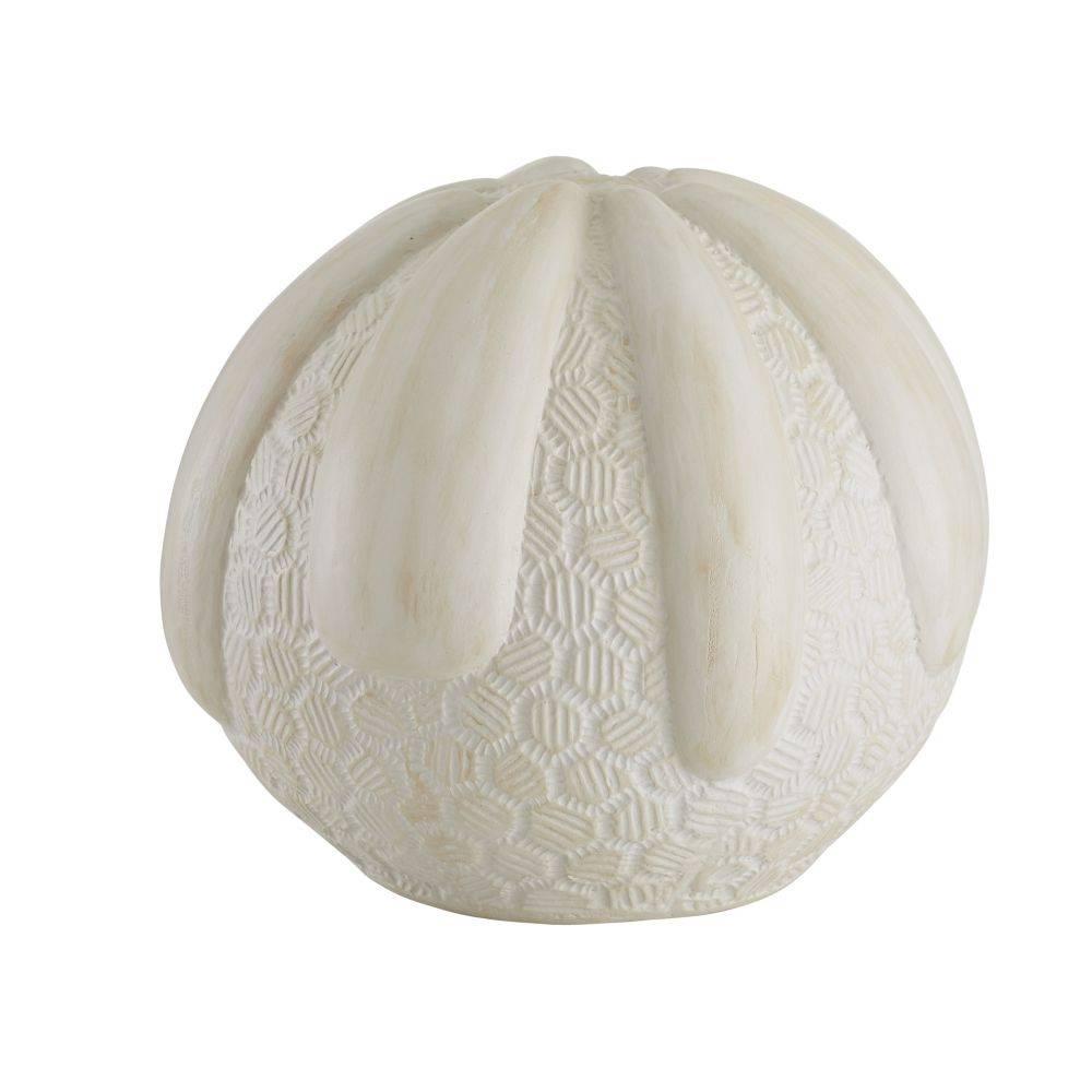 The rounded form of a sea urchin inspired our pair of terracotta sculptures. Each layered and textured style offers a pleasing mix of smooth and intricately carved textures. Glazed with a whitewash finish, they deliver a monumental presence wherever they are placed. Finish will vary.