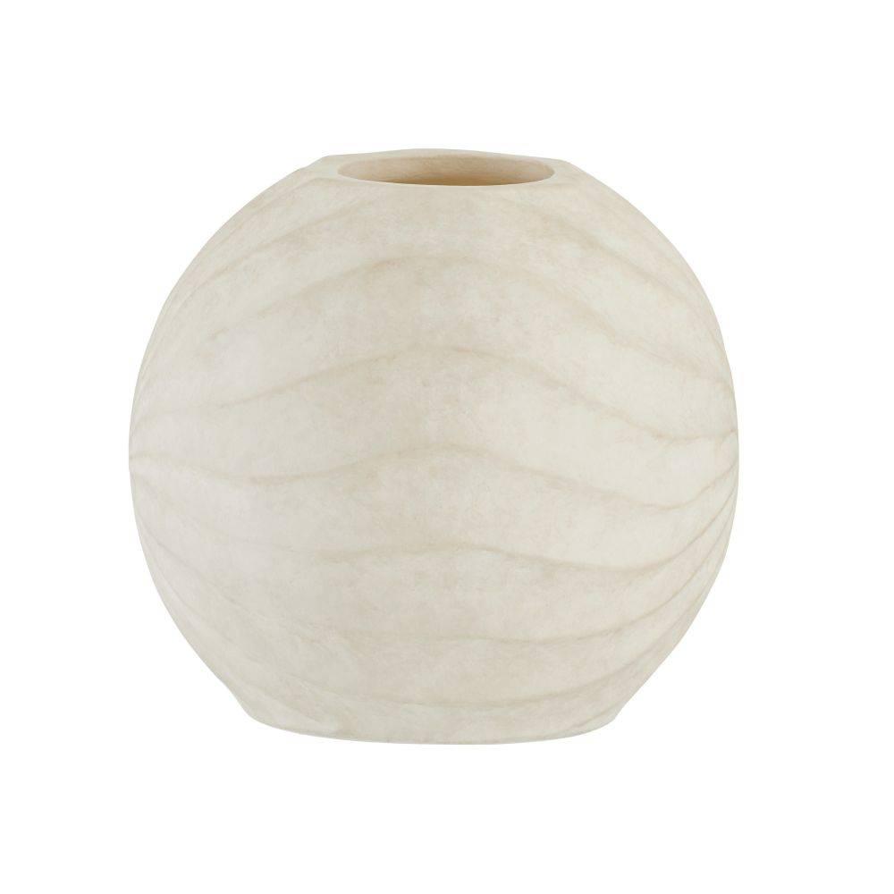 The rippled and rhythmic patterns of a Nautilus shell find a visual echo in a vase of eggshell-glazed terracotta. Each ridge of the hand-sculpted form spirals together to create a striking, contemplative piece. Finish will vary.