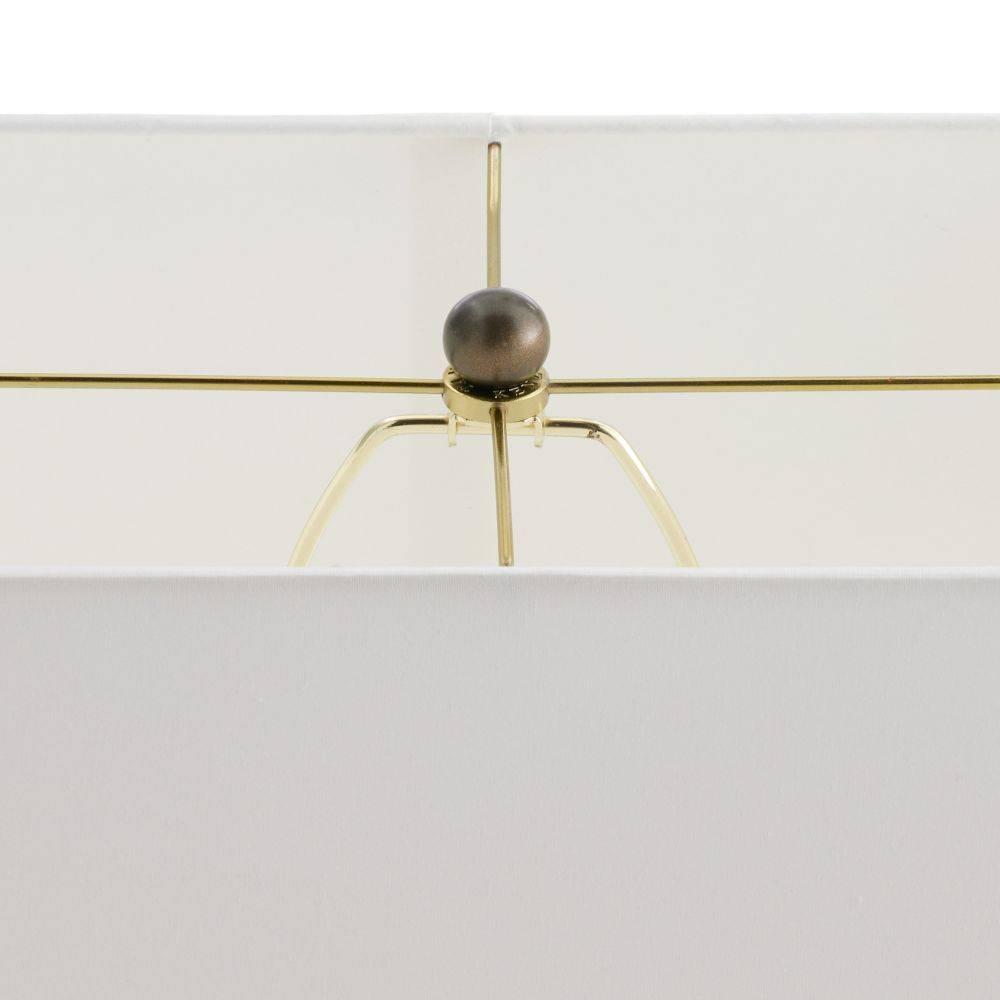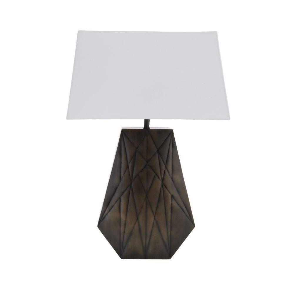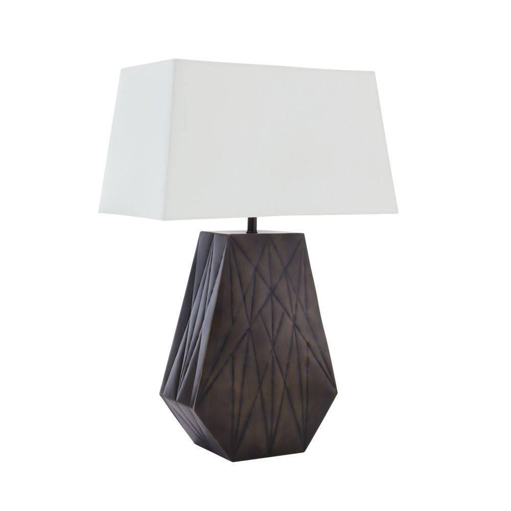 Inspired by a New York City skyscraper, this table lamp's grooved texture was designed to appeal from every angle. Crafted of bronze-plated iron, it floats within the room, illuminating with a billowed effect. A rectangular off-white cotton shade and matching finial add to the lamp's graphic appeal. Finish will vary.