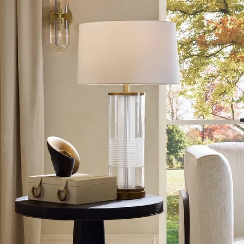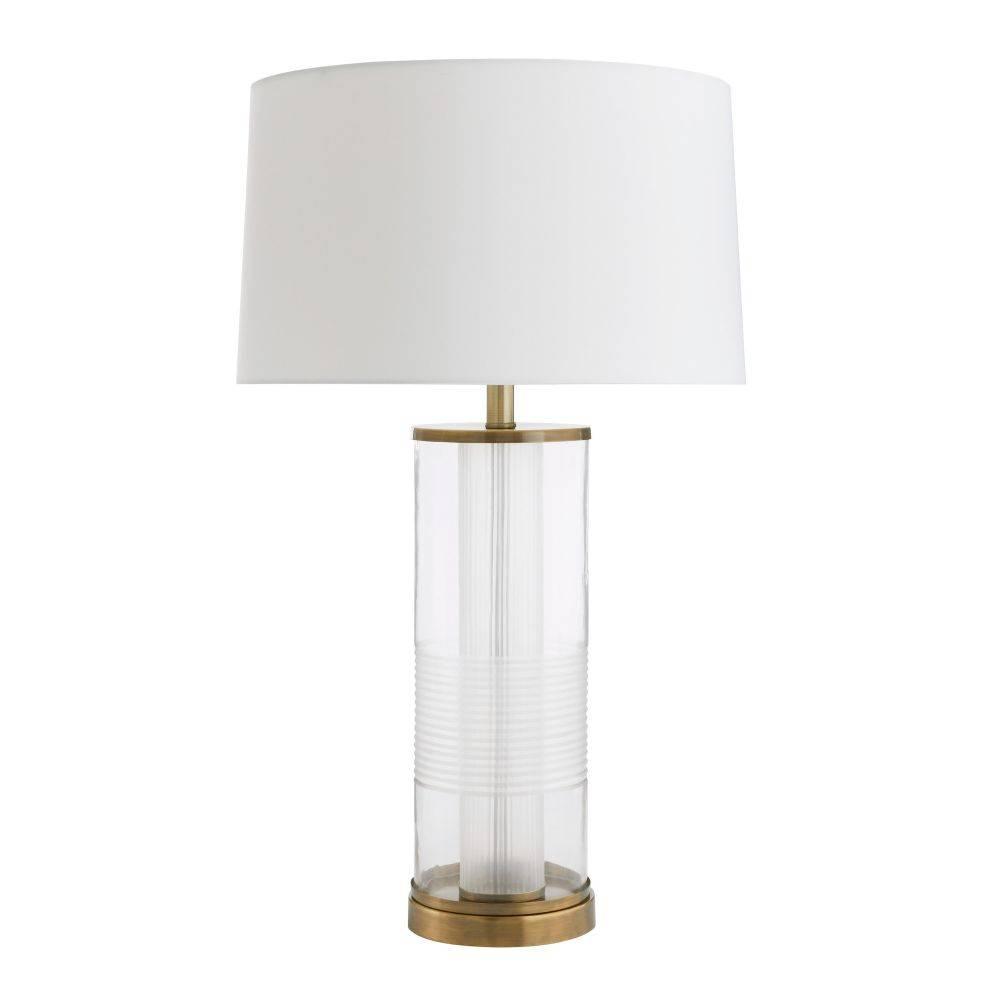 Clear etched glass and vintage brass form an alluring combination on our tailored table lamp. A brass-plated iron base is surrounded by intersecting etched cylinders that play with layering and transparency. An off-white microfiber drum shade lined in off-white cotton is secured with a matching finial.