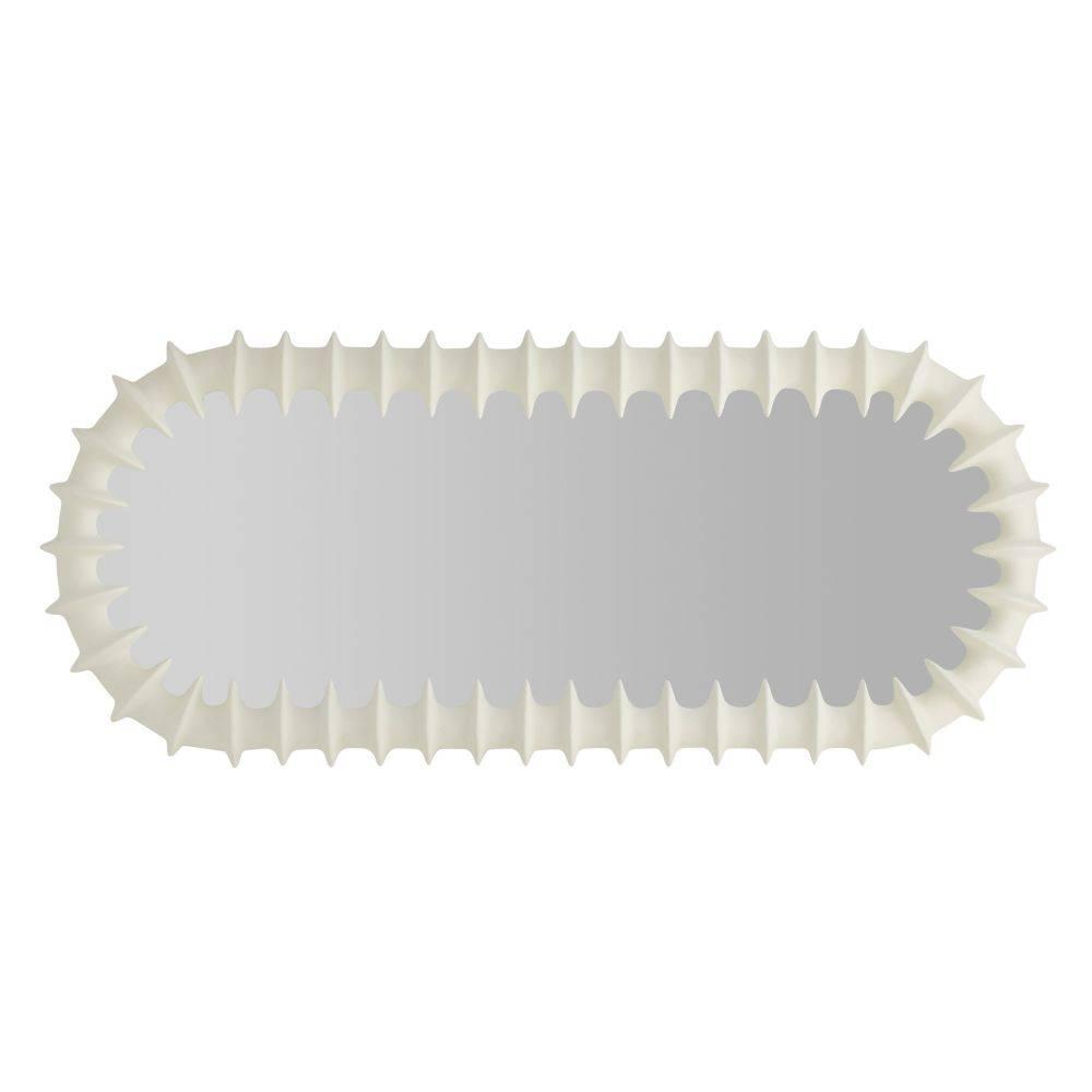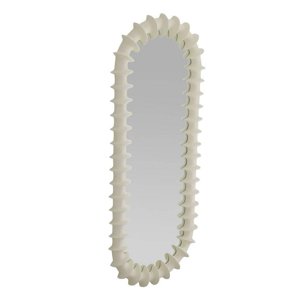 A textural frame of matte ivory resin ripples and flows to recall the ridges of a spine. Its intriguing finish converges inward, creating dimensionality on any wall. Designed to be displayed both vertically and horizontally. Secured at the back with a cleat attachment.