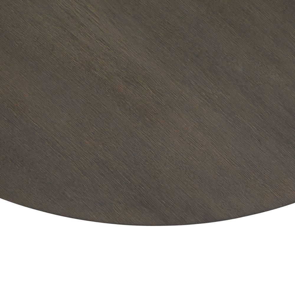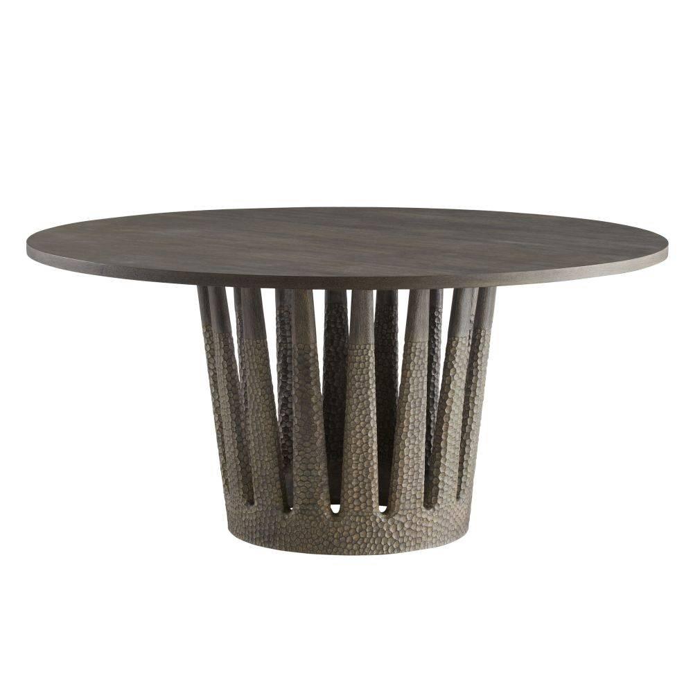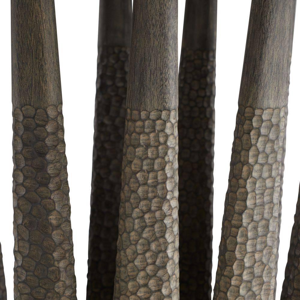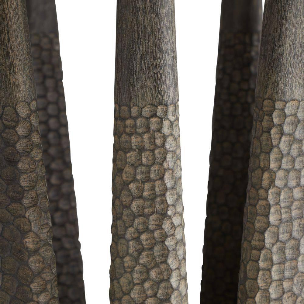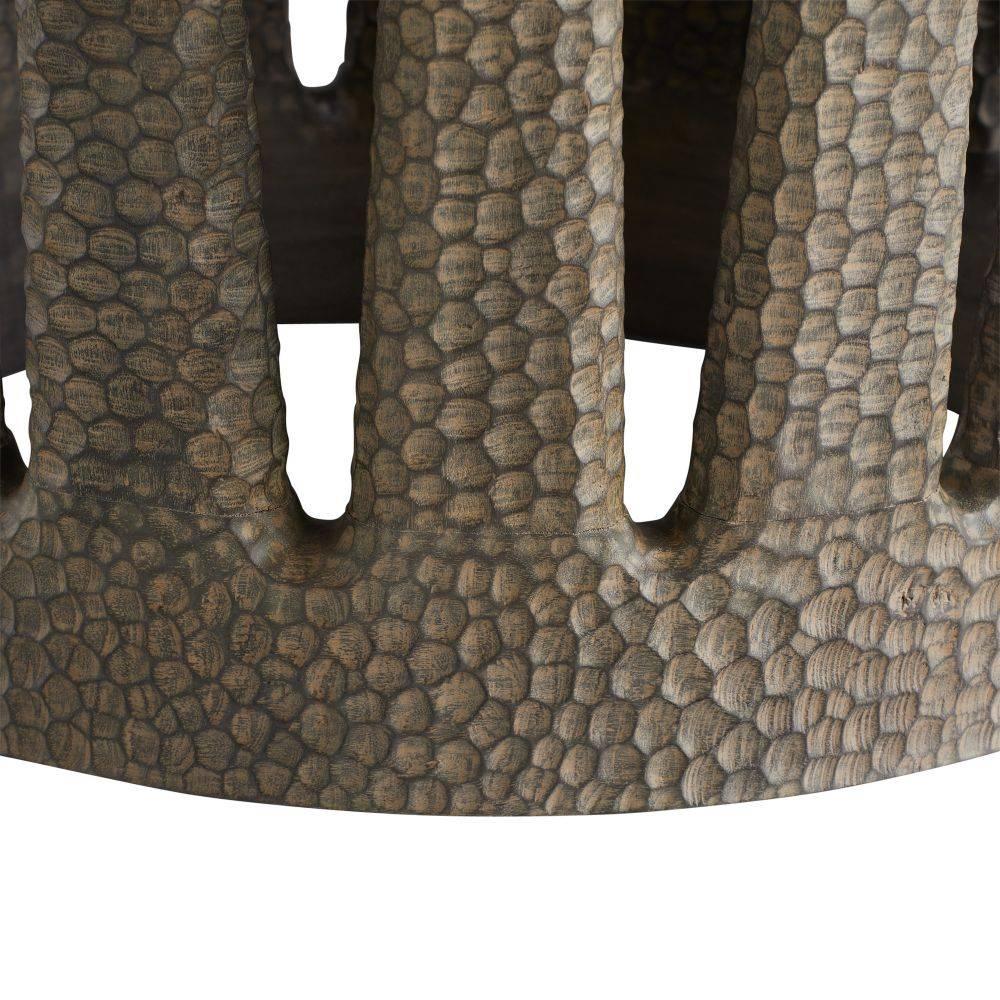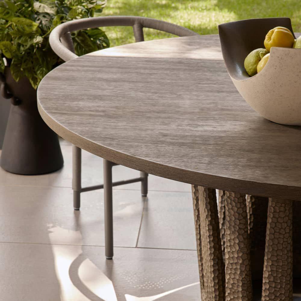 A tapered crown base adds a sculptural motif to a generously sized outdoor round table. Hand-carved of Kona teak wood, Gilman's stippled details surprise and delight with a display of expert craftsmanship. This natural finish interacts intriguingly with light as the day passes. Finish will vary.
