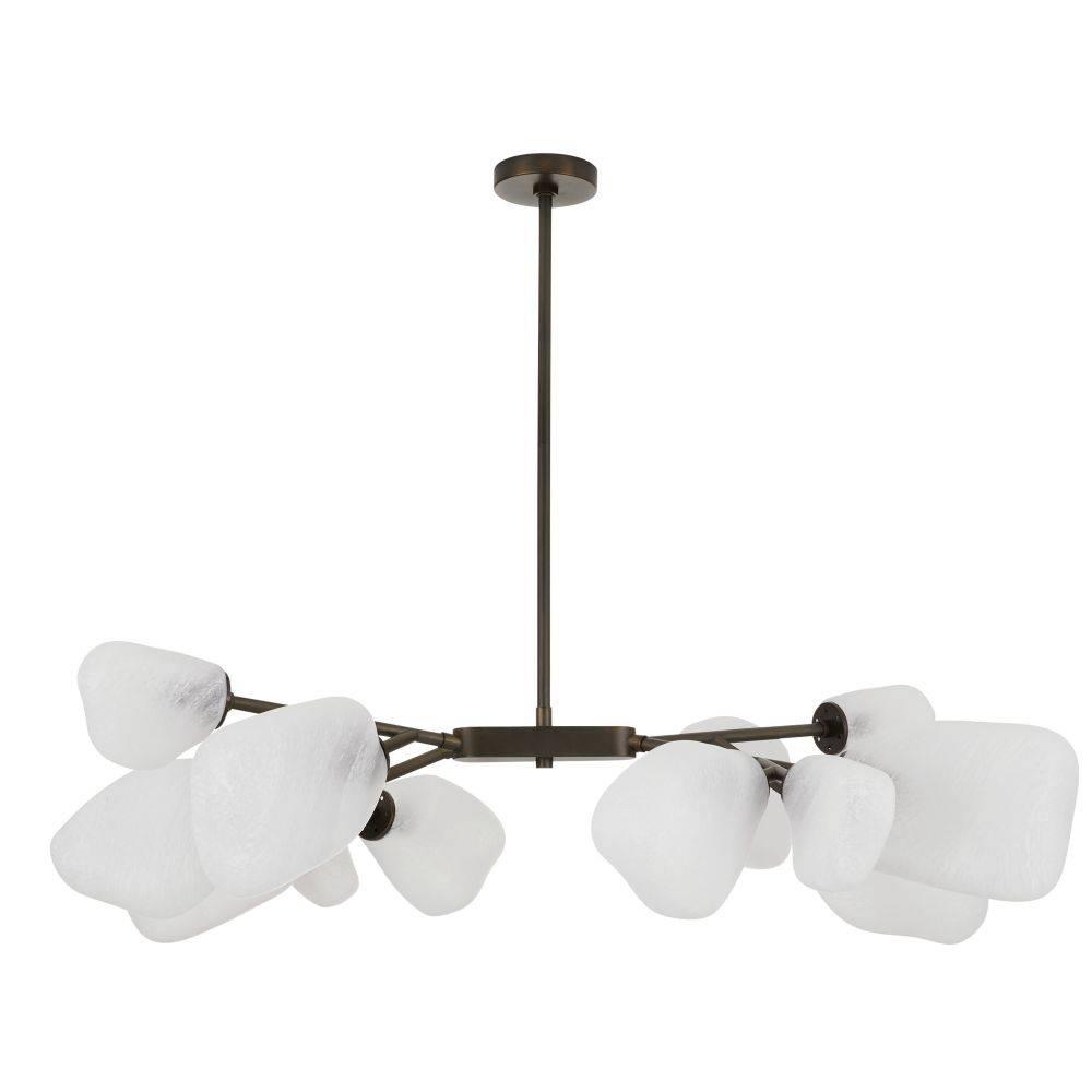 Billowing, modern frosted glass rounded cubes lend an organic feeling to our impactful chandelier. Each irregular shade differs slightly, giving this sculptural fixture a unique presence. Suspended from a branched form of English bronze-plated steel with matching pipe. Damp-rated, although limited covered outdoor areas may affect finish.