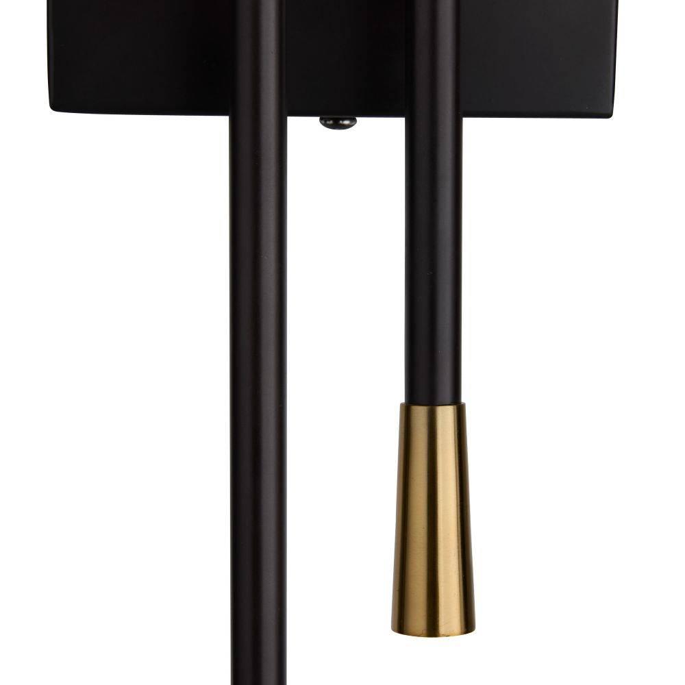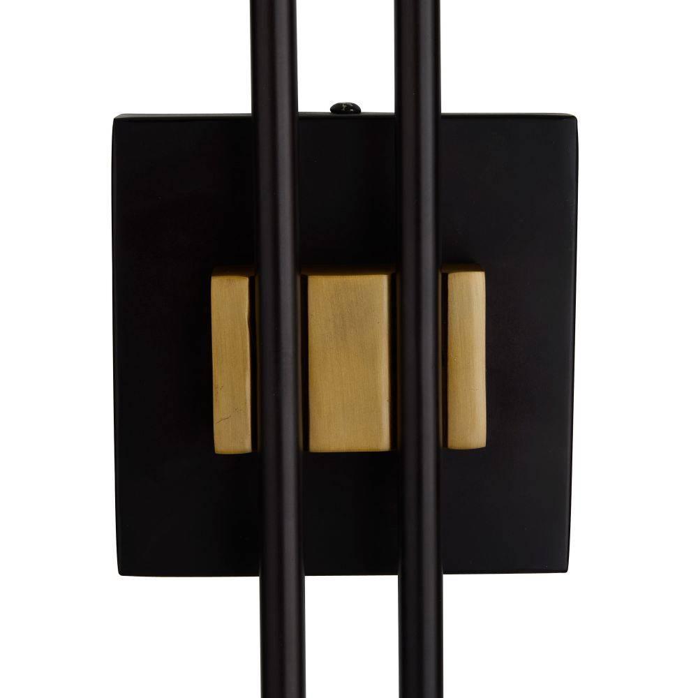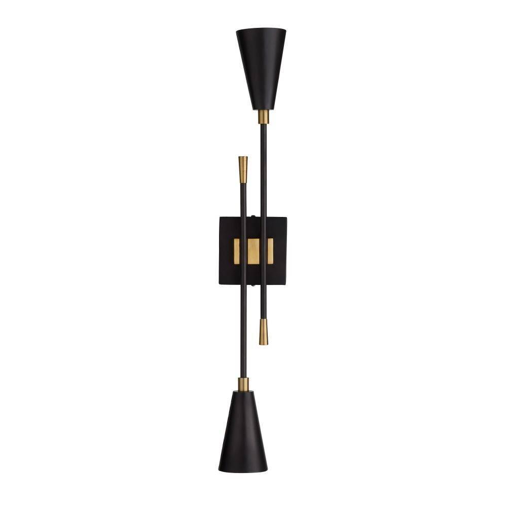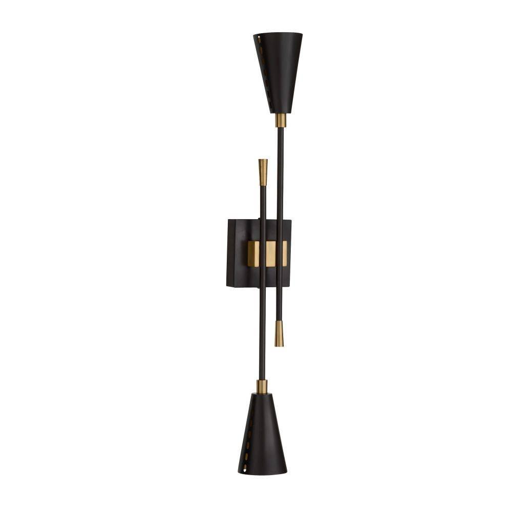 Dual trumpet shades aim light both upwards and downwards in a stylishly tailored bronze-plated iron sconce. Antique brass-plated iron details glimmer at the connection points between the pipe and backplate and inside each sleek shade. Perforated for an intriguing light bleed, the Herrera can be hung vertically and horizontally. Damp-rated, although limited covered outdoor areas may affect finish.