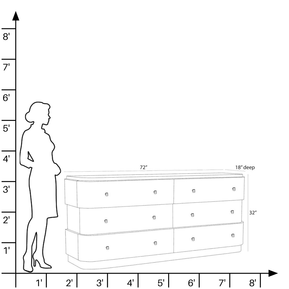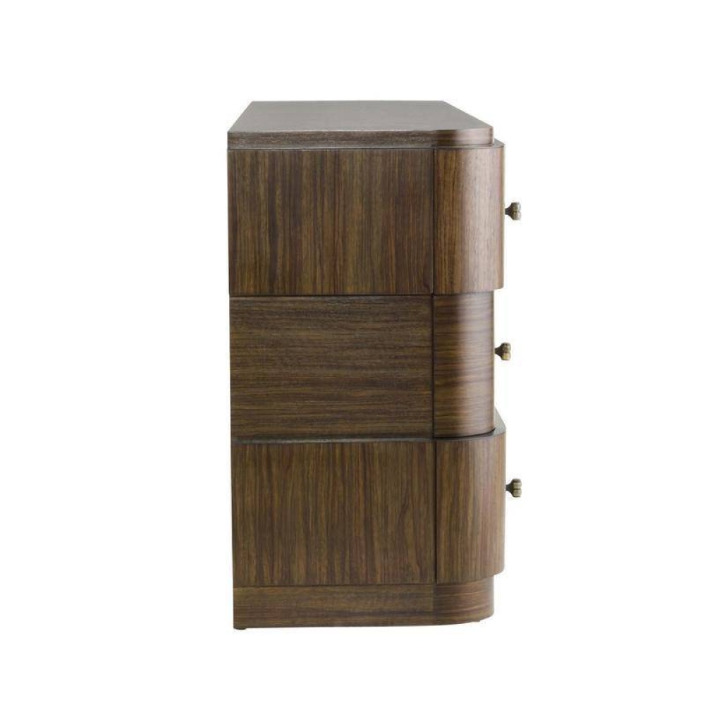 We reinvented the stacked campaign-style chest in A brindle ofram wood veneer with rotated layout veneer that creates different patterns to catch the eye. Six soft-close drawers are accented with bespoke bronze stainless steel trim along the reveal and natural faux horn resin pulls. This roomy style is impactful on its own as bedroom storage or paired with matching Jacques side tables. Finish will vary.