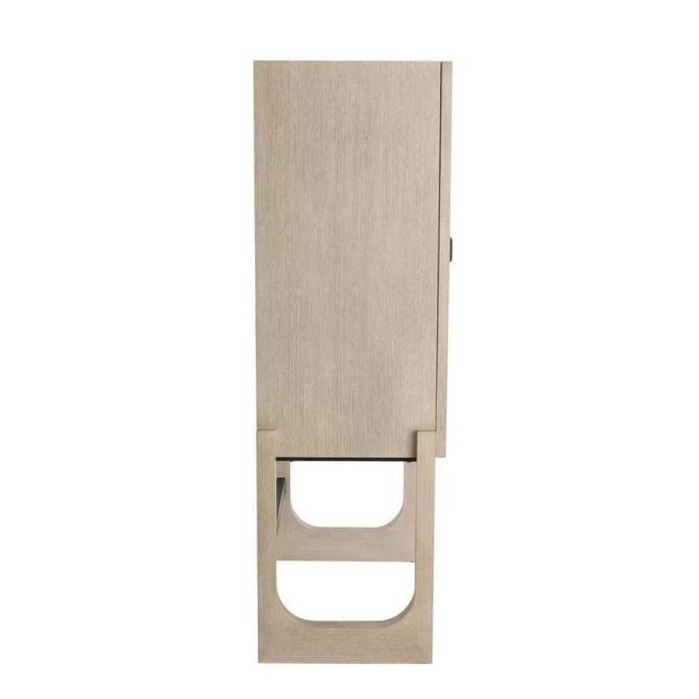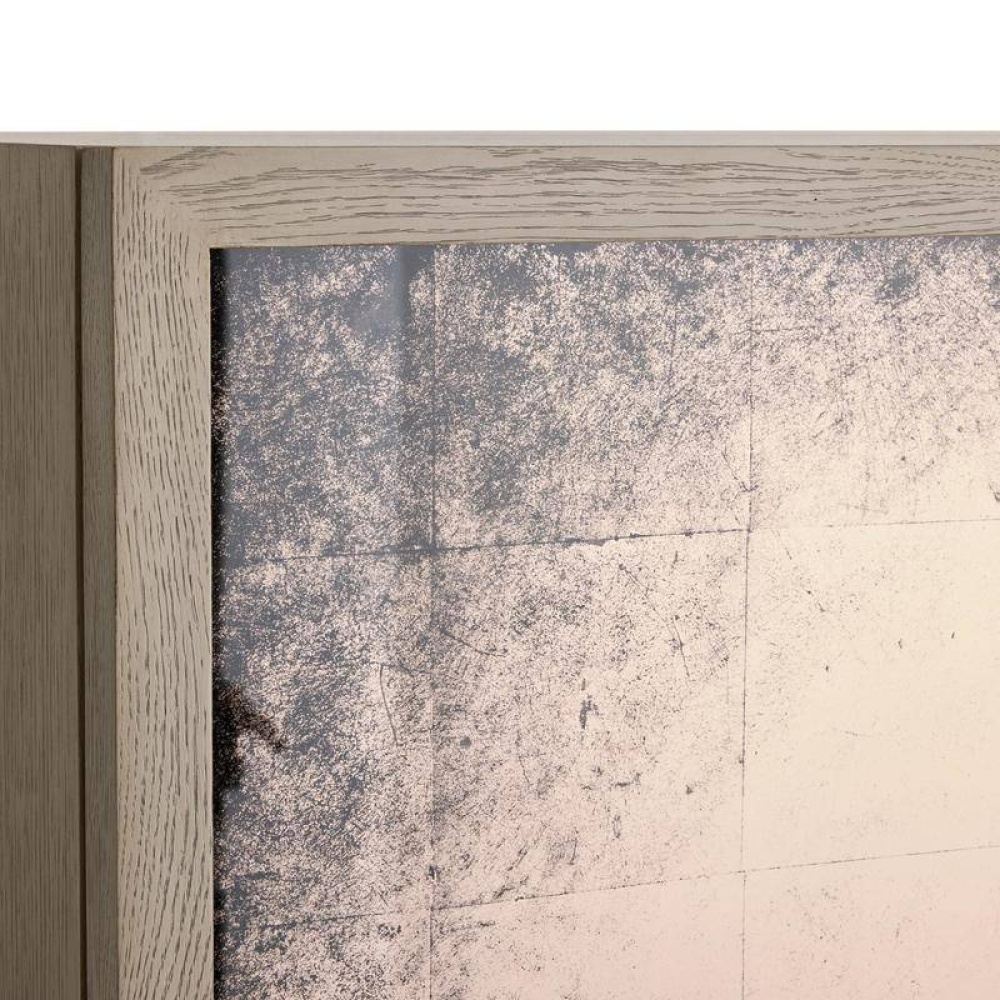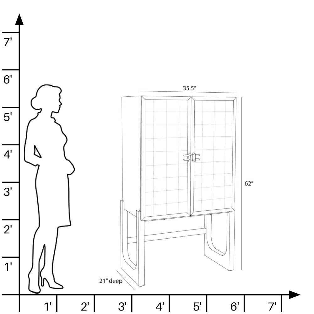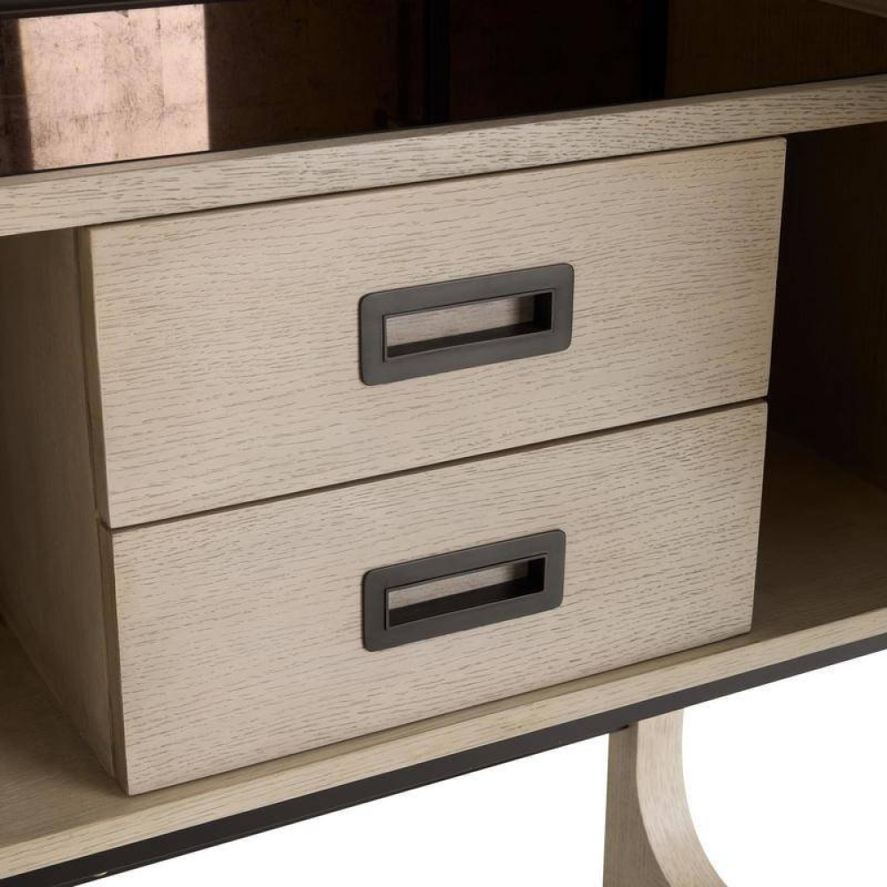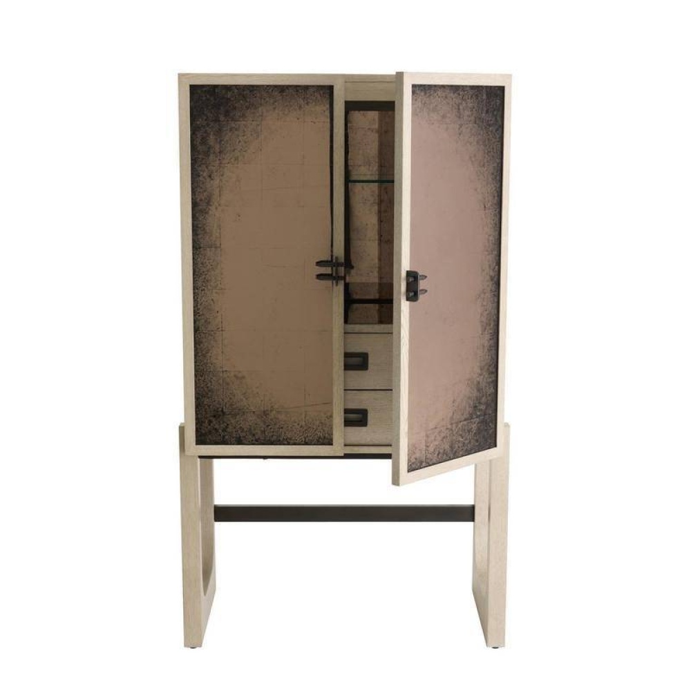 Our alluring cabinet is inlaid with an églomisé antiqued amber mirror front to appear darker along the edges and lighter at the center. The elevated case of smoke oak wood features a U-shaped cutout at the legs to add an airy finish. Double spear pulls of bronze iron appear to pierce the surface, while a matching iron bar at the back pulls the silhouette together. Double soft-close doors open to reveal an LED-lit clear glass prep surface and mirrored interior to showcase a chic cocktail glassware collection. Finish will vary.