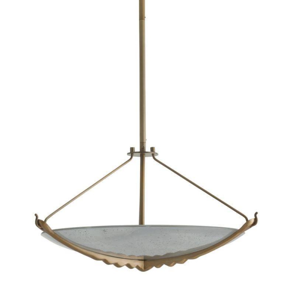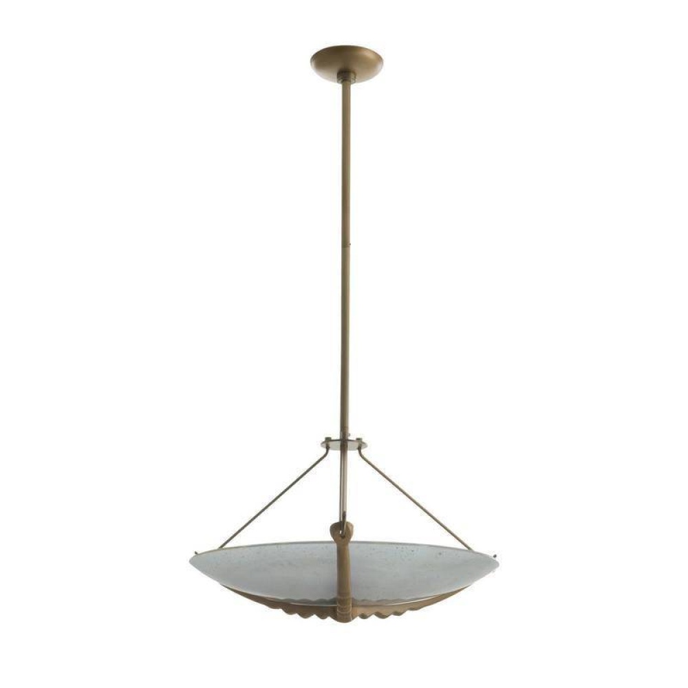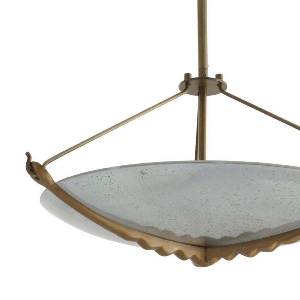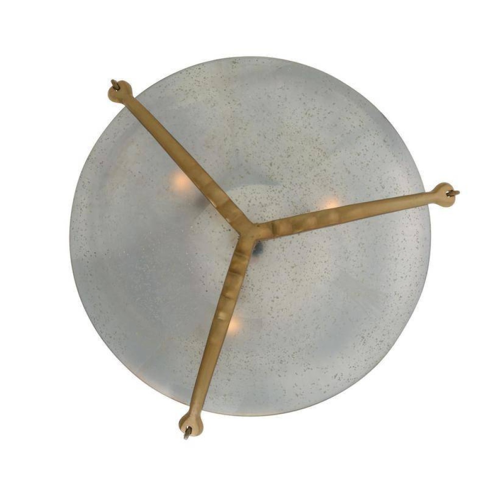 Skeletal structure informs a fixture of antique brass-plated iron. Each arm connects to suspend a frosted glass disc, providing a wash of light across the ceiling. The semi-flush fixture is suspended from an antique brass-plated iron pipe and holds a trio of candelabra bulbs. Damp-rated, although limited covered outdoor conditions may affect finish. Finish will vary.