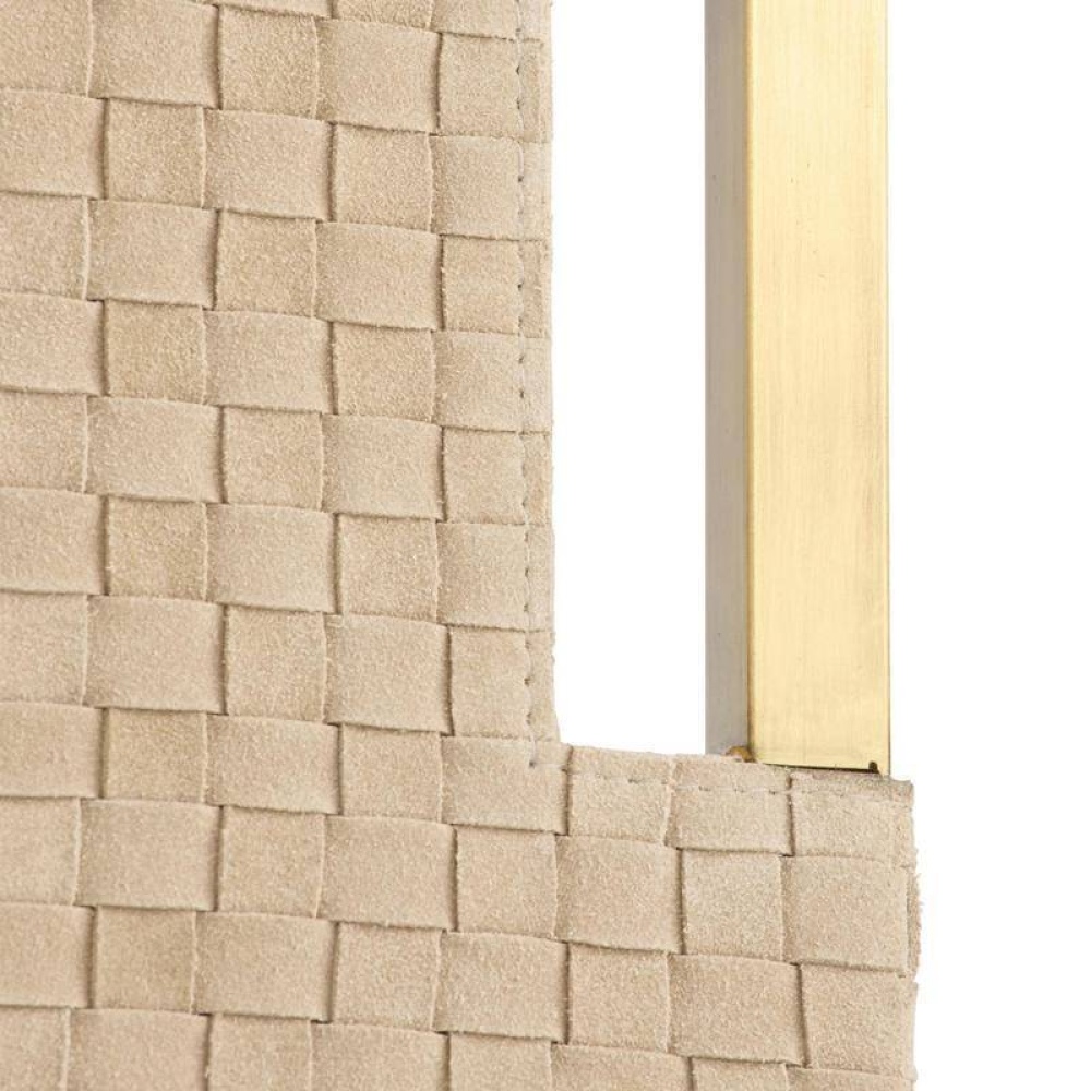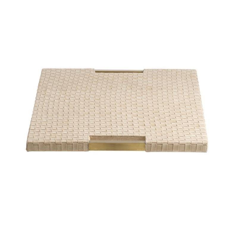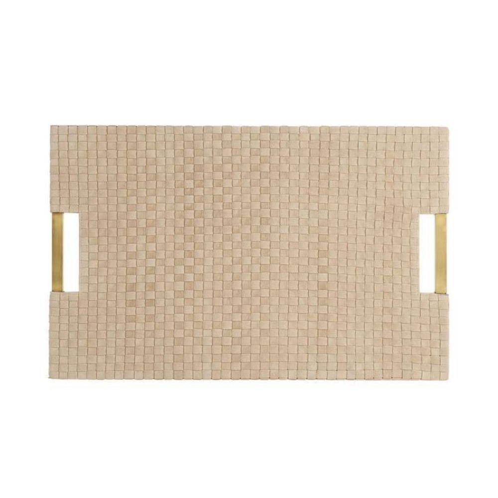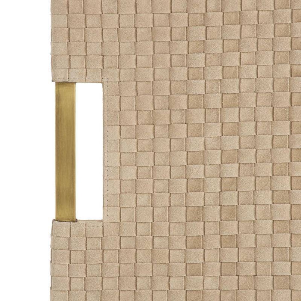 Strips of buttery yet sturdy taupe suede are woven in a checkerboard pattern to form our sophisticated tray. It is anchored by double handles of antique brass iron for easy movement. Designed to display books or accessories. Not suitable for holding drinks. Finish will vary.