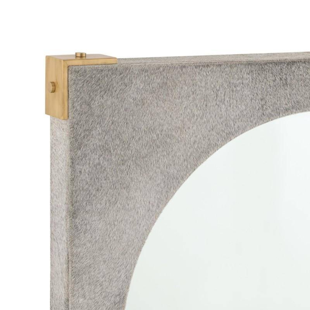 Lush gray hair-on-hide panels add textural appeal to our campaign-style mirror. Subtle gradations in tone make each frame one-of-a-kind. Bracketed by accents of antique brass hardware, they surround a recessed beveled glass mirror. Designed to be hung vertically by a back cleat. Hanging hardware included. Hide will vary.
