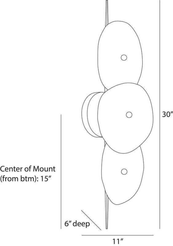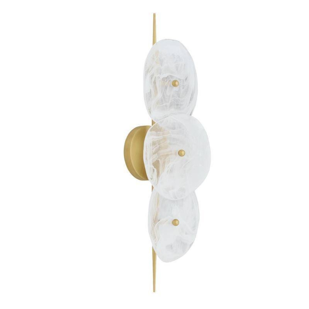 A slim kabob-like backplate lends a pierced effect to shades of hand-blown white glazed glass. Offering a mix of transparency and opacity, each free-form shape is secured with a steel antique brass finial detail and will differ slightly from fixture to fixture. Finish will vary. Damp-rated, although limited, covered outdoor conditions may affect finish.
