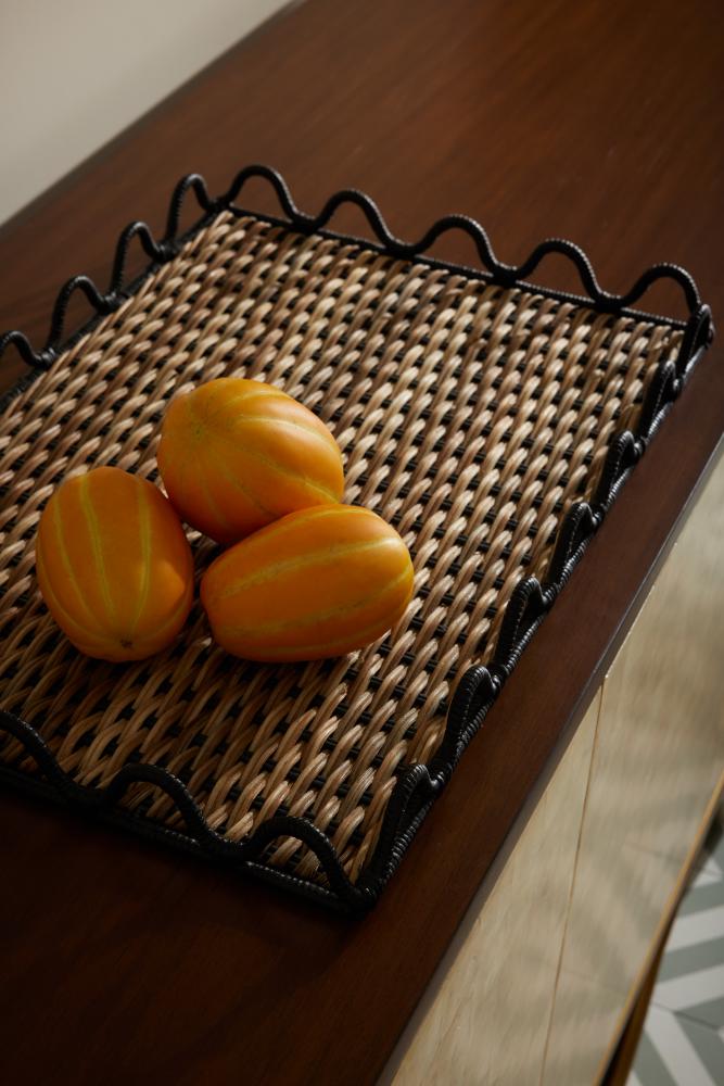 This Mar Tray is a nod to a tropical still life painting. Here it’s easy to imagine flowers and fruit flowing from these handmade natural and black rattan vessels that have an urbane quality by the addition of a noir wrapping detail. In-fact, the ink-stained finish, like a class little black dress, finds its importance throughout the collection, allowing many pieces to hold both the place of formal and informal.