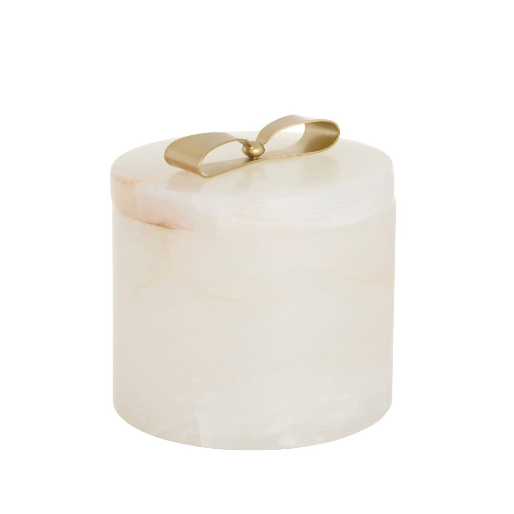 A chic, rounded container of white onyx is all tied up with a bow-shaped handle of antique brass iron. Colors and variations in the stone make each piece unique. This box is more impactful when displayed with its smaller companion. Finish will vary.