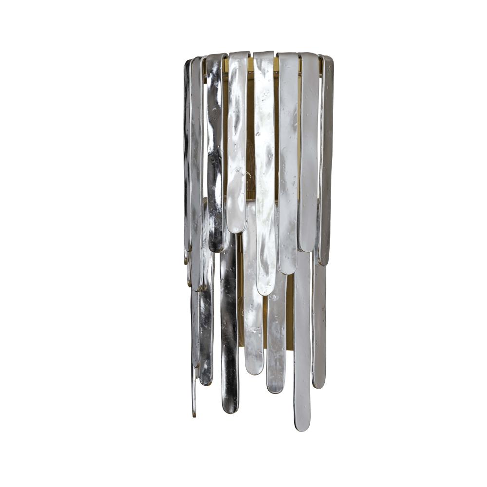 OUR RAINE SCONCE WAS INSPIRED BY THE VINTAGE MURANO GLASS LIGHTING MADE POPULAR IN THE ’60S AND ’70S. THE CASCADING SILHOUETTE IS EMBELLISHED WITH HALF-ROUND LAYERS OF BLUE SMOKE LUSTER SEEDY GLASS IN STAGGERED SIZES. THE LUSTROUS GLASS PIECES FOLD OVER A TIERED IRON FRAME, WHICH IS FINISHED IN ANTIQUE BRASS. THE RESULT IS A DRAMATIC AND TEXTURAL WATERFALL EFFECT. THE GLASS STRIPS CAN BE REMOVED TO PROVIDE ADDITIONAL ILLUMINATION IF DESIRED. FINISH WILL VARY. DAMP-RATED, ALTHOUGH LIMITED COVERED OUTDOOR CONDITIONS MAY AFFECT FINISH.