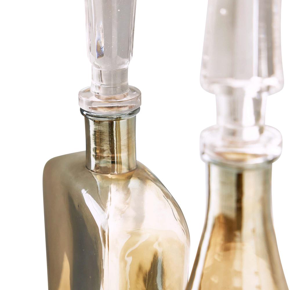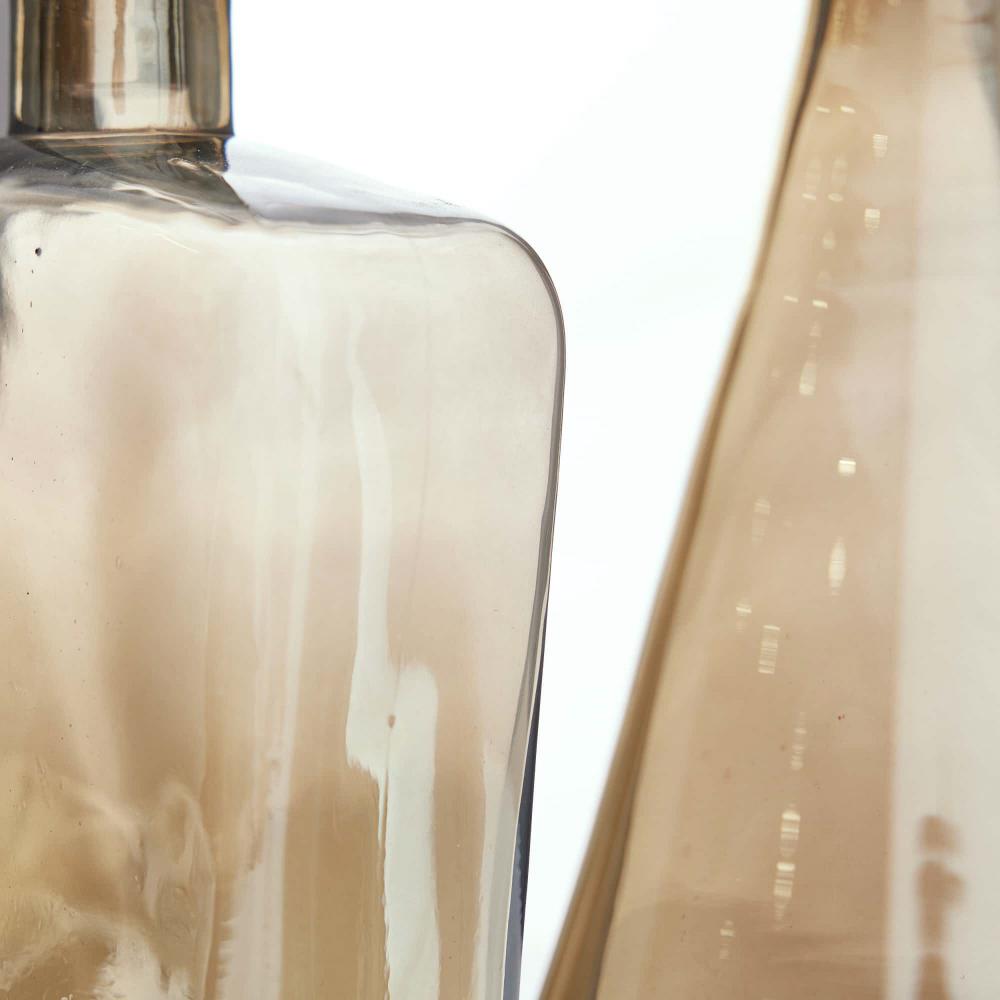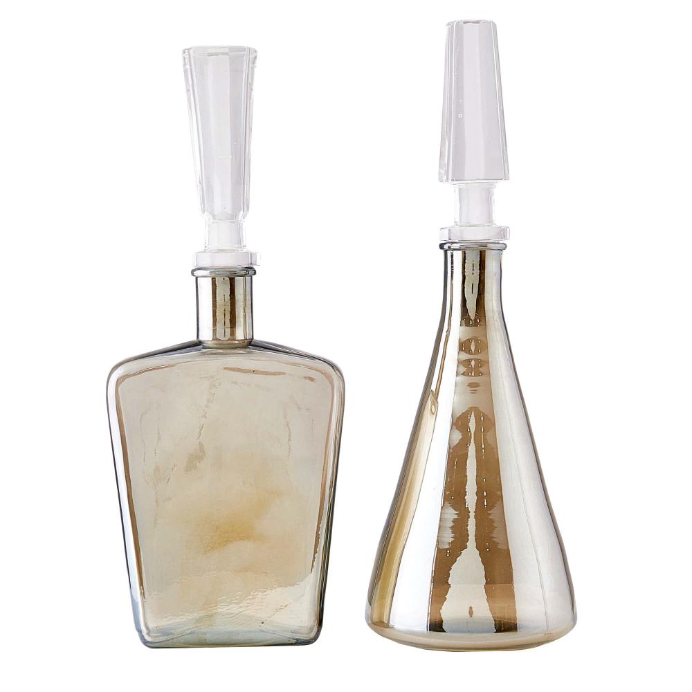 A SOPHISTICATED WAY TO SERVE UP FAVORITE LIBATIONS, THIS PAIR OF TALBANY DECANTERS MAKE FOR COMPANION SILHOUETTES. CREATED IN CLEAR AND SMOKE LUSTER GLASS, WITH FACETED, DECORATIVE GLASS STOPPERS, THE SIZABLE VESSELS IMPART A MOODY MODERNITY TO ANY BAR. FINISH WILL VARY.