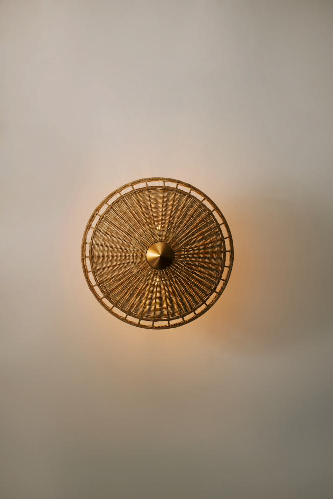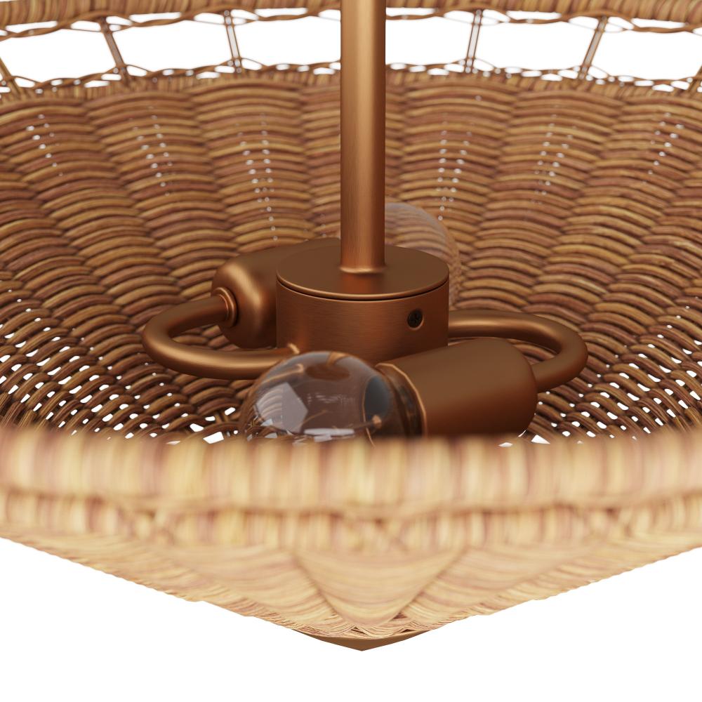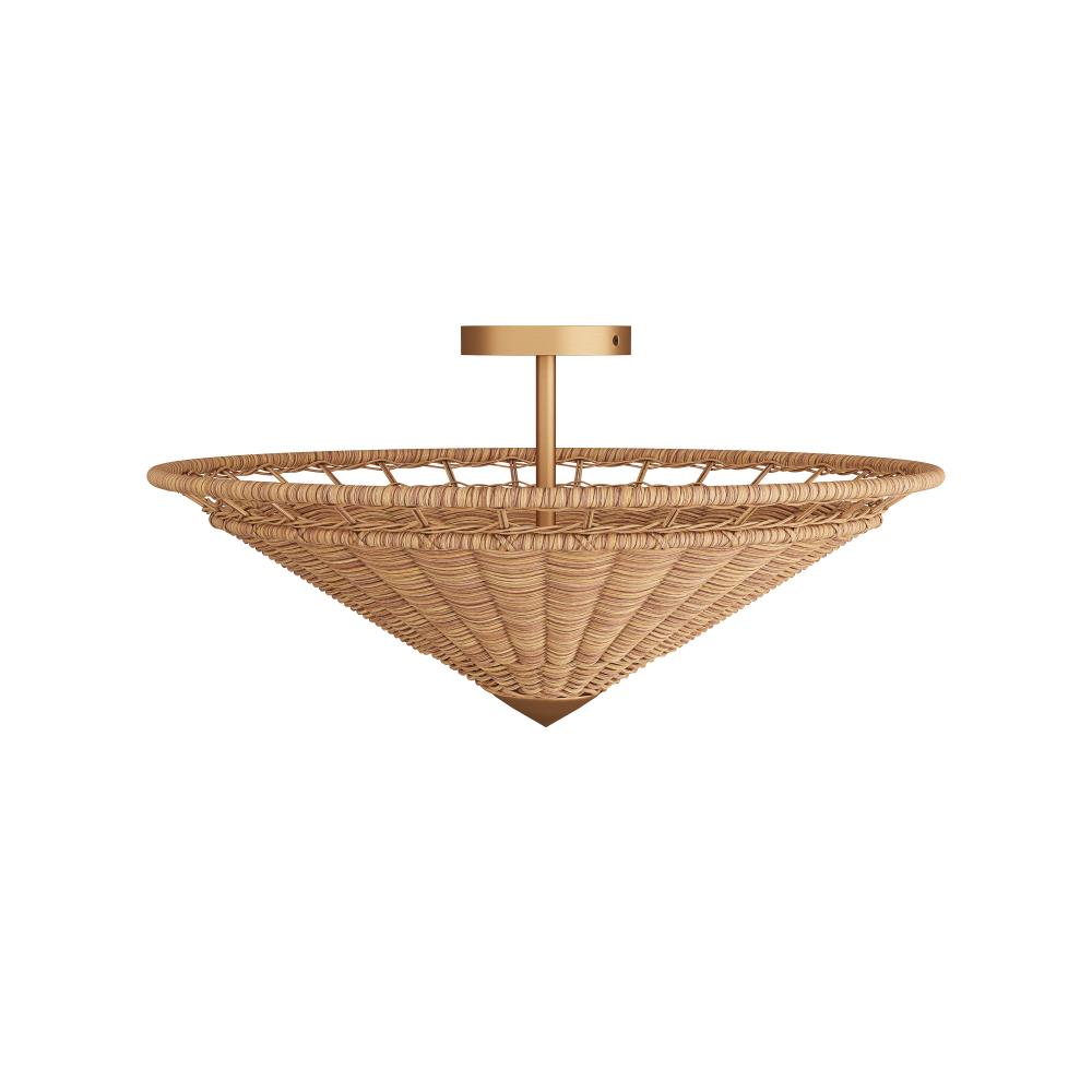 A continuation of the Terrace family, this flushmount is made up of natural, handwoven rattan. The ceiling mount and centerpoint tip are crafted of gold steel finished iron that contrast the whimsical silhouette.