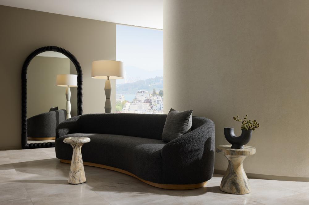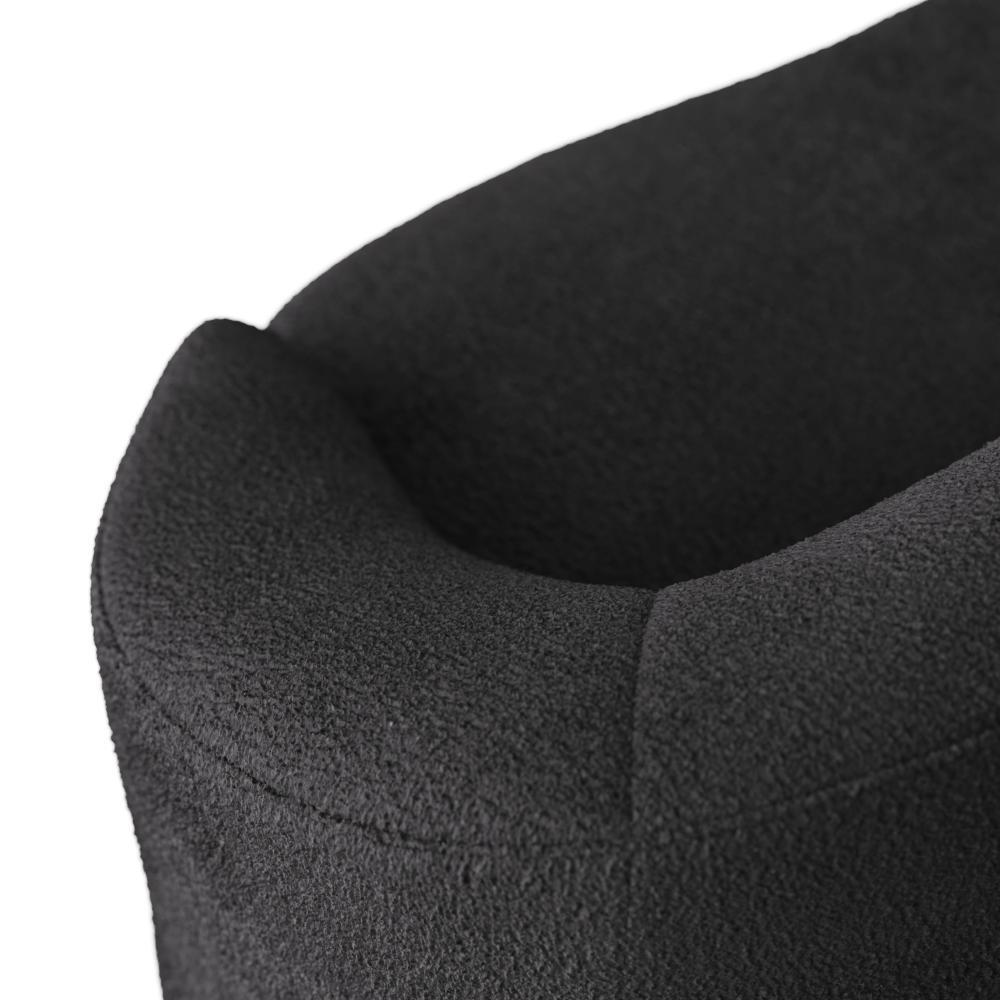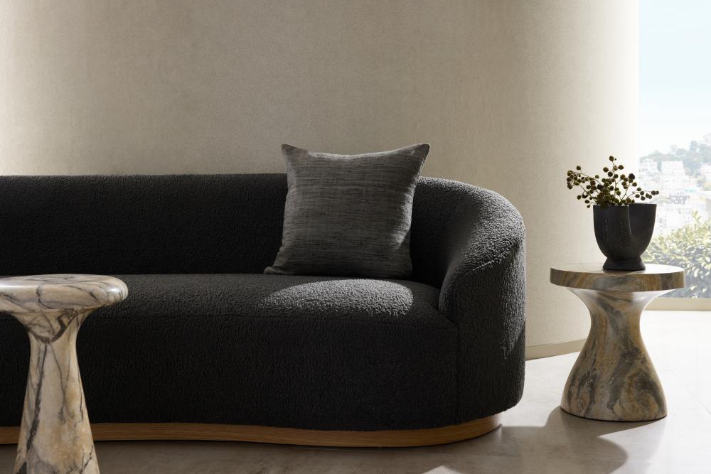 This voluptuous sofa gets updated in a textural charcoal bouclé finish. Delivering a high-glamour finish with a sexy curved silhouette, this plush design is sleek but inviting, making it the perfect anchor for any room that is built for entertaining. A white oyster-finished base of white oak anchors this design.