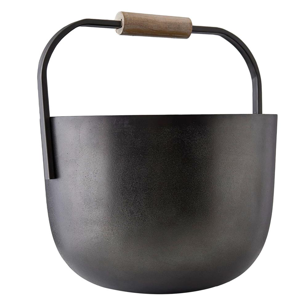 A FIREPLACE ACCESSORY WITH SERIOUS PRESENCE, THE VERMEER FIREWOOD BASKET IS FORMED FROM BLACKENED CAST ALUMINUM AND FEATURES A WOOD HANDLE OF MANGO WOOD FINISHED IN SMOKE. THE OVERSIZED VESSEL OFFERS A STYLISH WAY TO BUNDLE LOGS, KINDLING OR OTHER HOME FURNISHINGS. FINISH WILL VARY.