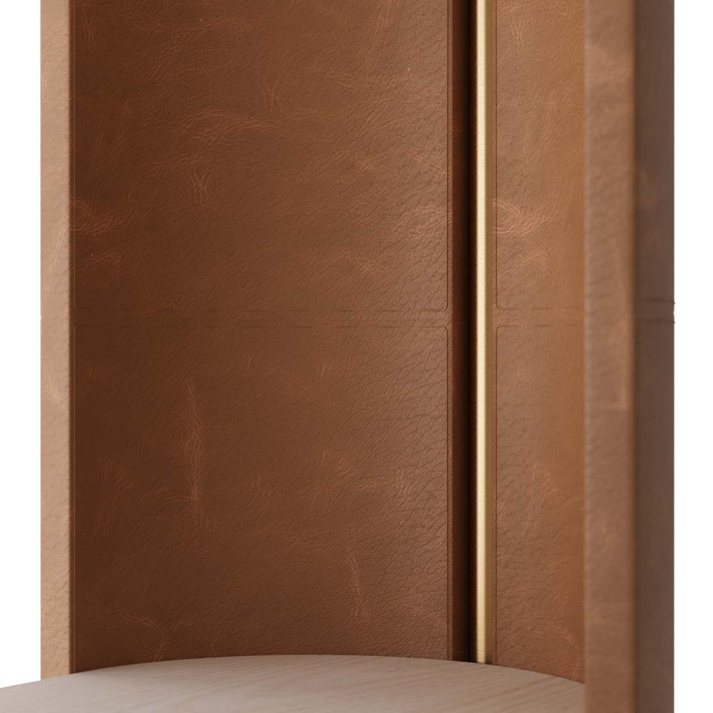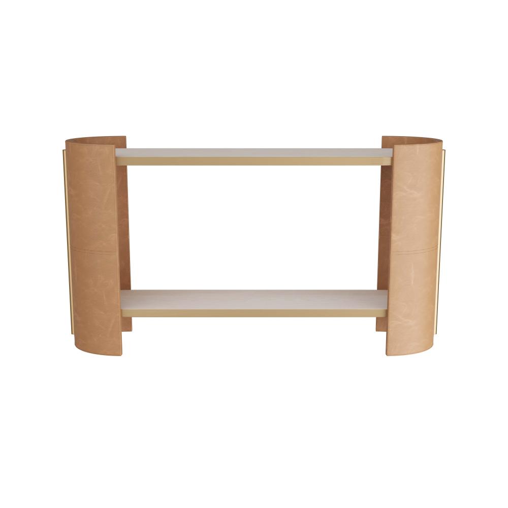 THE WARLEY OFFERS PROOF THAT INCORPORATING A STYLISH EDGE DOESN’T HAVE TO MEAN RIGHT ANGLES. DESIGNED WITH A SMART MIX OF CONTRASTING FINISHES AND MATERIALS, THE CURVED CONSOLE IS CONSTRUCTED IN A CAPSULE SHAPE WITH TWO SMOKE OAK SHELVES THAT SUSPEND INSIDE ARCHED, RUSSET LEATHER-WRAPPED BASES. ANTIQUE BRASS IS USED AS BANDING AROUND EACH SHELF AND AGAIN AS CYLINDRICAL EMBELLISHMENTS ON EACH STITCHED, LEATHER END CAPSULE. FINISH WILL VARY.