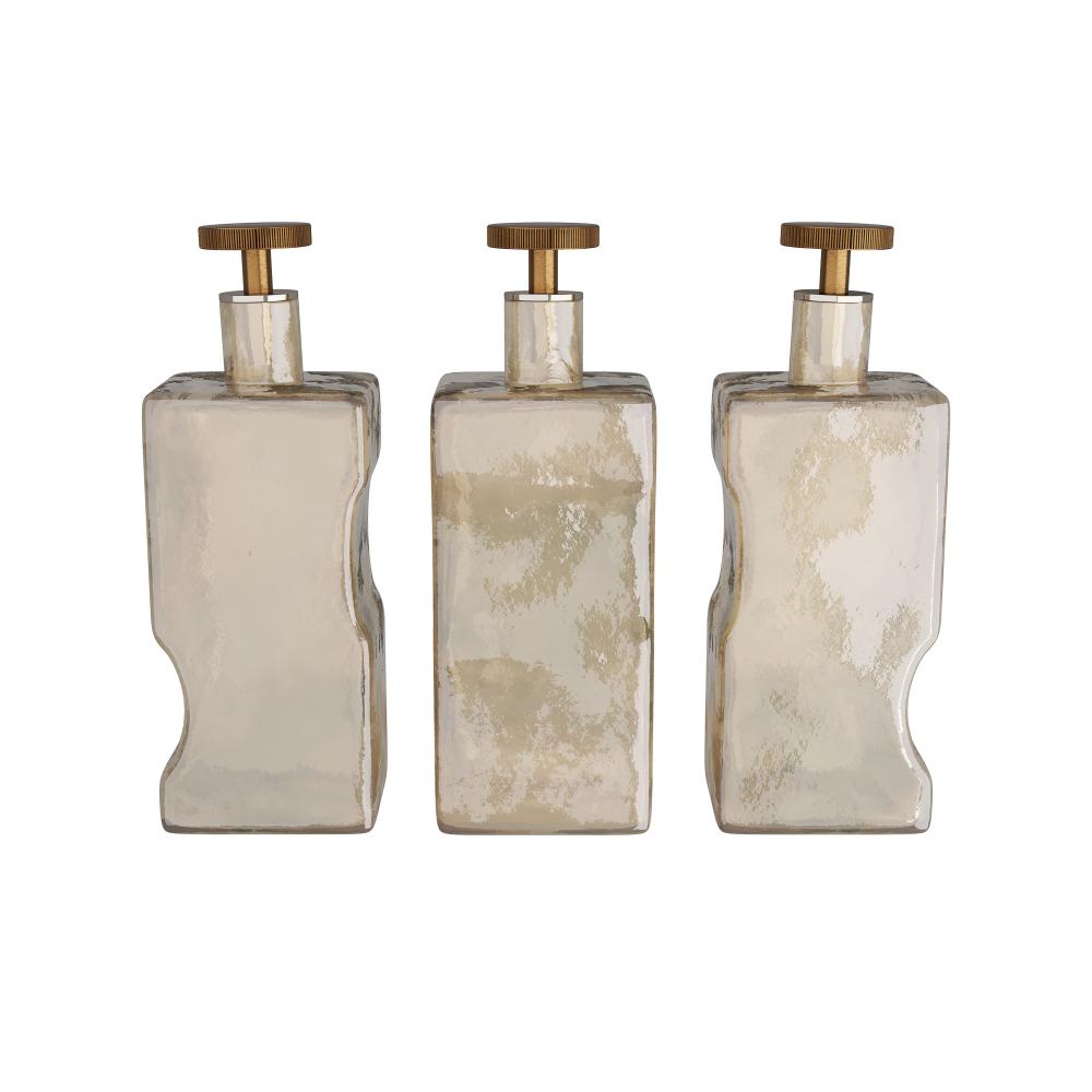 Decanters of smoke luster glass make an industrial-inspired statement. Designed with free form indentions for a handmade feel, each cast sculptural design is topped with a ribbed stopper of vintage brass. Set of three. Finish will vary.
