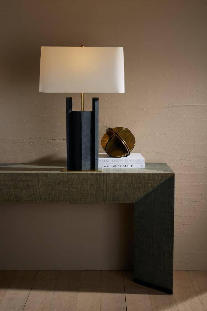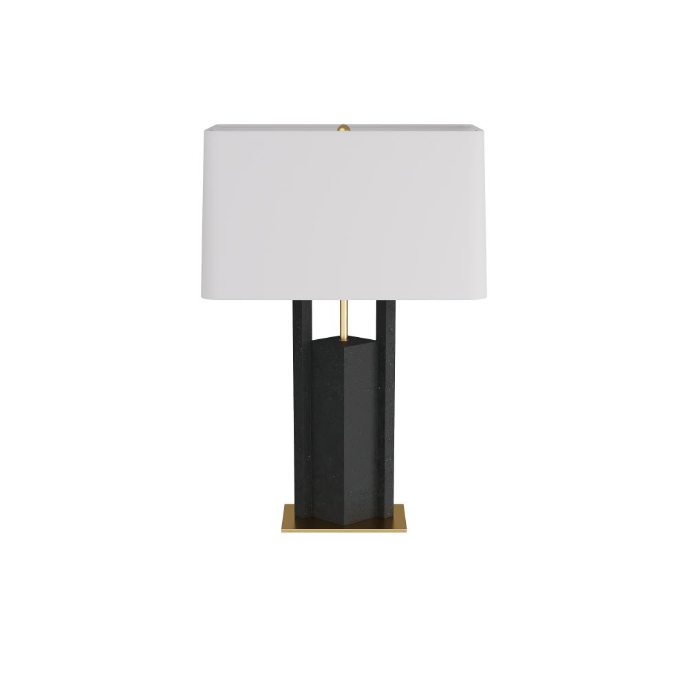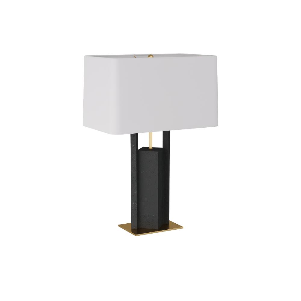A modern geometric form of charcoal ricestone composite adds edge to the traditional table lamp. Accented with an antique brass support and base for contrast, this geometric style is a masculine, modernist accent for any room. Topped with a rectangular drum shade in off-white microfiber lined in cotton. Taupe cloth-wrapped cord and three-way rotary switch.