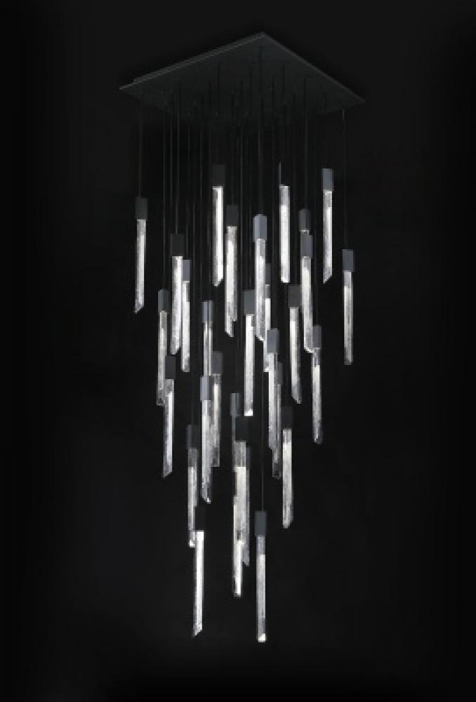 The Alpine collection's signature cascading marbleized crystals artfully evoke rainfall. Thirty-one angular crystals suspend from a sleek canopy to cast a dramatic glow.