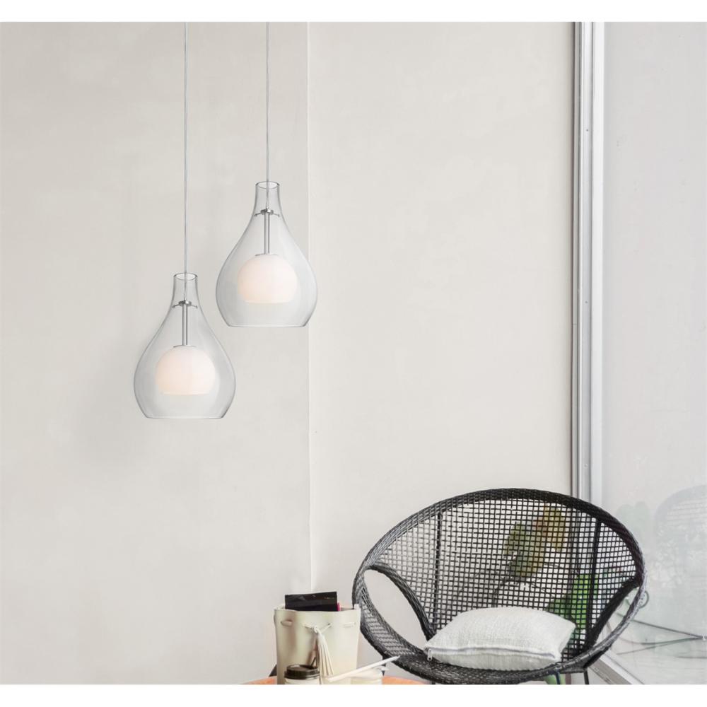 The distinctive Elle 11 Pendant is composed of an outer tear-drop trans gray glass shade, complemented perfectly with a blown opal glass sphere. The inner opal conceals the light source, while both diffusing and directing downward the output of the light source. The pleasing play of light and dimension through the Elle makes for a soothing optical effect. The cord pendant fixture is equipped with a 10' SVT cordset and a low profile flat monopoint canopy. These stylish and functional luminaries are offered in a beautiful Black finish.