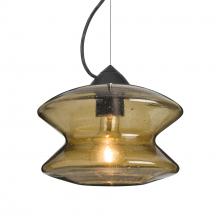 The Zen Latte Pendant is a transitional design composed of a transparent Latte "Hour-Glass" shaped glass , with an interesting bubble pattern blown randomly throughout the glass The pleasing play of light through the shade's bubble accents makes for a striking affect, created by the exposed light source positioned inside the shade. The cable pendant fixture is equipped with a 10' silver aircraft cable and AWM cordset, and a dome monopoint canopy. These stylish and functional luminaries are offered in a beautiful Black finish.