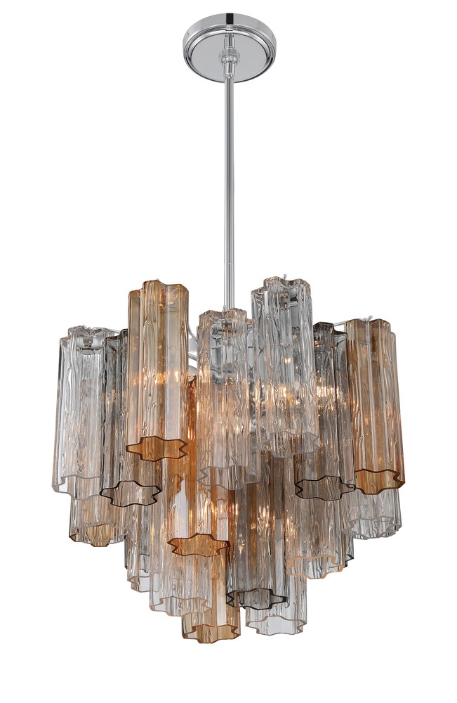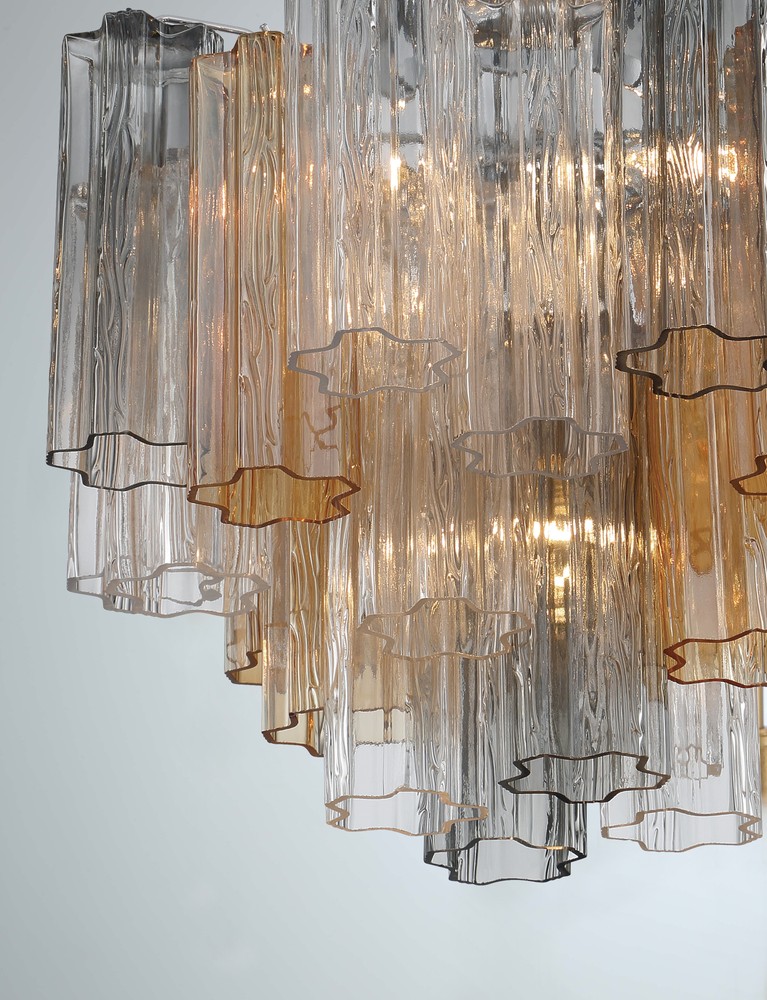 The captivating Addis Lighting Collection is a modern-day interpretation of the iconic mid-century Tronchi chandelier. Inspired by its predecessor's sleek lines and geometric shapes, the Addis features a polished Chrome or Aged Brass metal frame that exudes sophistication and style. Its unique design showcases transparent tiers of textured Tronchi glass tubes, forming a mesmerizing 5-point rounded star shape. Choose from a range of glass colors, including clear, amber, smoke, and white, or the stunning Autumn option, which features a captivating multicolor disposition of amber, clear, and smoke Tronchi glass. The Addis Lighting Collection offers various sizes and finishes, allowing you to find the perfect fit for your space while adding a touch of timeless elegance.