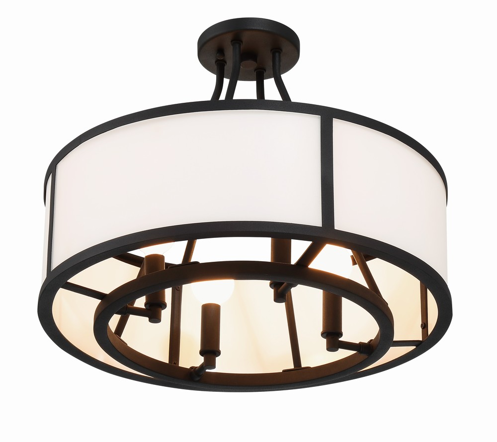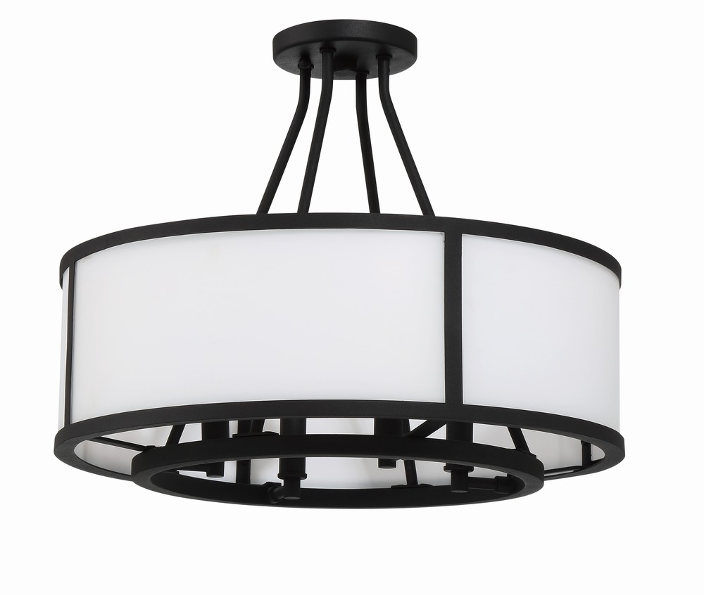 Showcasing a classic drum, the Bryant is crafted with a white glass shade and black steel frame. The outer drum surrounds an inner suspension of candelabra sockets. The contrasting materials and bold graphic lines provide a design-driven style and a striking visual accent to many interior settings.