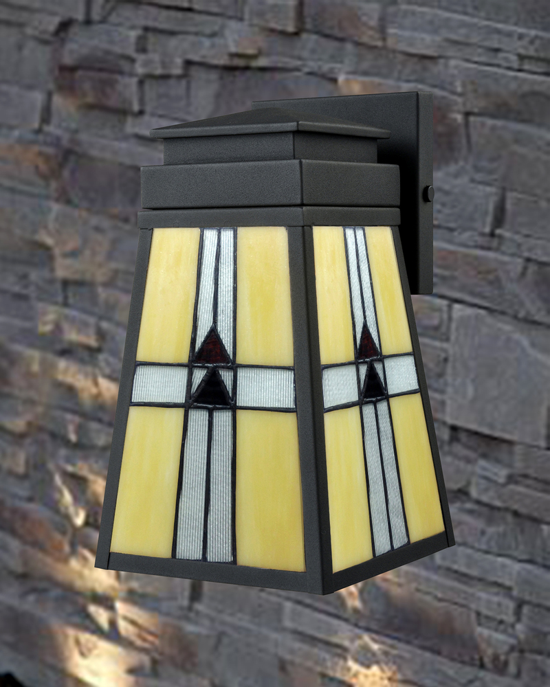 Our lovely Barkley Outdoor Wall Sconce features Mission design influences that will easily accentuate any exterior design in your home. The sconce features an elongated shade that is gently flared at the bottom. Each side features 4 large panels of sunny amber at its corners. These are bisected by a cross design of clear frosted glass that is outlined in dynamic black filigree. A pair of arrowhead shaped glass jewels at the center of each panel adds an extra Mission era touch and a bold splash of color when Barkley is illuminated. Barkley hangs from a square metal backing plate and wall arm, both finished in rich black to match the filigree. Our Barkley Outdoor Wall Sconce is a fantastic addition to a porch or patio area that will make bold design statement for years to come.