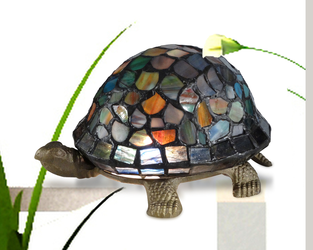 Our artisans are known for their meticulous attention to detail and nowhere is that attention to detail more evident than this delightful blue turtle accent lamp. 143 pieces of hand rolled and copper foiled art glass in glistening opalescent shades of blues, greens, cream and red form the shell of this little reptile. The turtle’s body forms the base of the lamp. The scaly detail of the turtle’s skin is so realistically represented in the cast detail, which is finished in antique bronze. This little fellow is perfect for any room in your home or office where you want to add a little touch of whimsy to your decor.