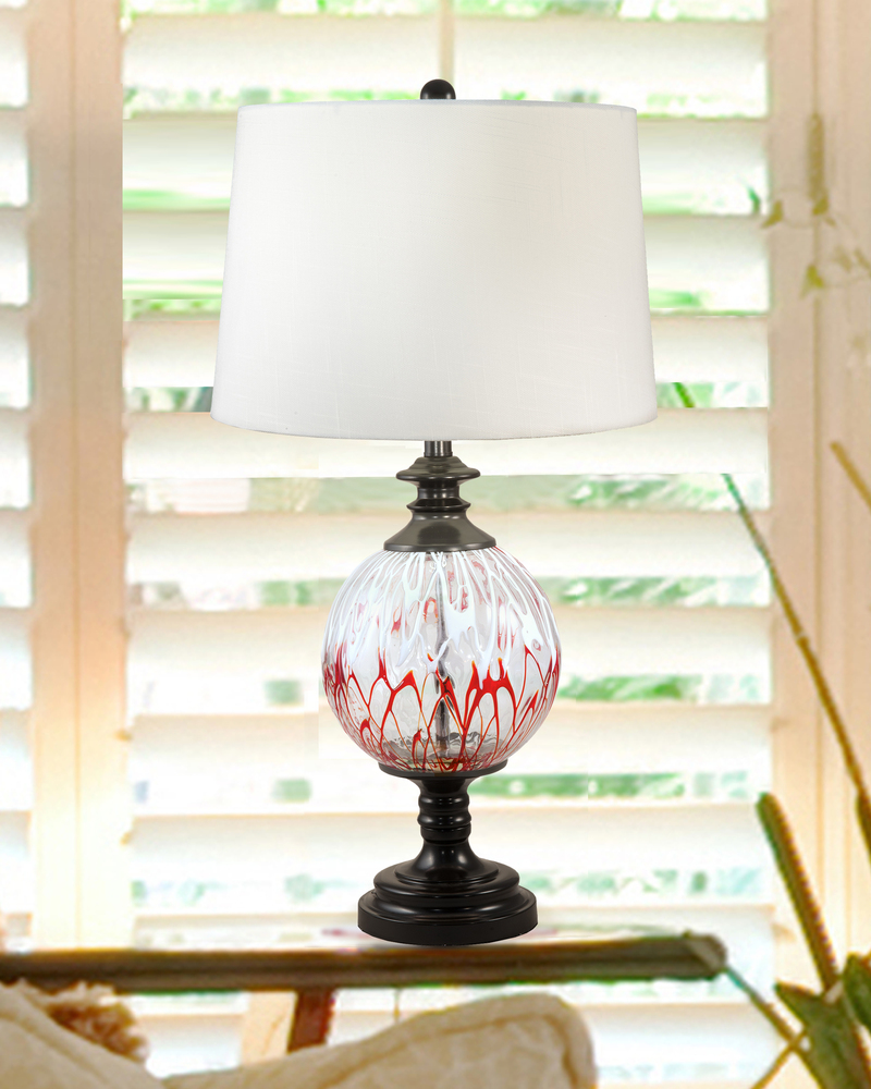 Our innovative Halen Globe Painted Crystal Table Lamp features a unique blend of color and texture that will easily assimilate into any home’s décor. The center column features a large clear crystal orb that is blended with a web of painted designs. The metal base is finished in rich Ebony Black and features an elongated flange atop the round pedestal and complementary vase cap. We topped the lamp with an elegantly simple drum shade in crisp white fabric and added a crystal finial to complete the look. Simply stunning when displayed in pairs on matching end tables or nightstands, our Halen Painted Crystal Table Lamp will provide your family with years of innovative and artistic lighting.