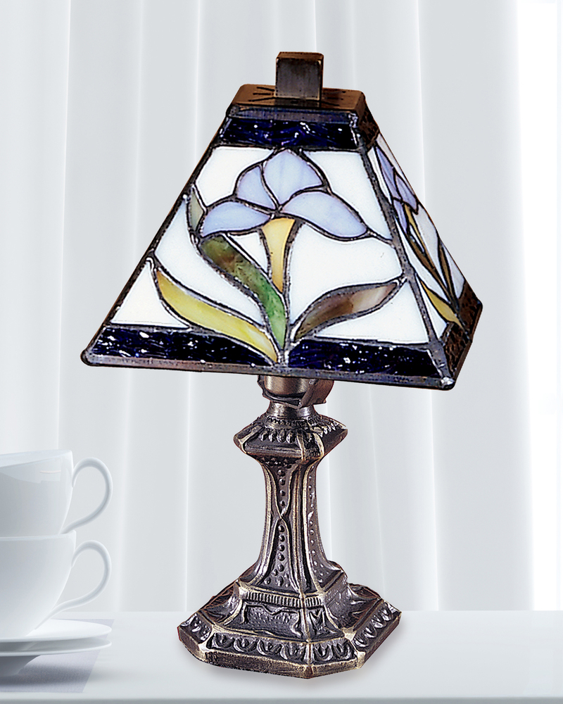 A lovely little iris blossom graces each of the 4 sides of square shade on our Irene accent lamp. The delicate blue bloom with green foliage sits against a bright alabaster background. Bands of darker blue run along the top and bottom of the shade to frame the beauty of the flower. The metal base features an intricate textured pattern and is finished in antique brass. This delightful lamp is perfect for a desk, end table, nightstand or anywhere needing a subtle touch of color.