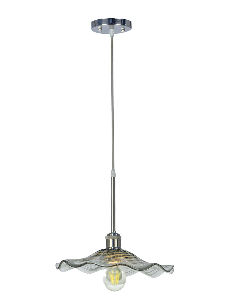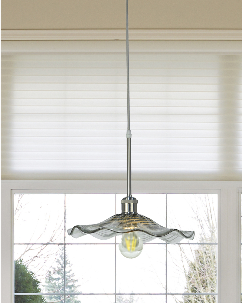 This pretty Kourtney Mini Pendant provides a warm touch of artistic light to any decor style in your home. The ruffled shade features a background of bright amber with dark amber accents swirled throughout, extending to the outer edge to border the shade and tie the entire design together. The fixture hangs elegantly from a sleek metal ceiling canopy, support tube and vase cap, all finished in gleaming Satin Nickel. Our Kourtney Mini Pendant is a great choice over kitchen islands, breakfast bars, dining tables or gaming tables that you will display proudly for many years to come.