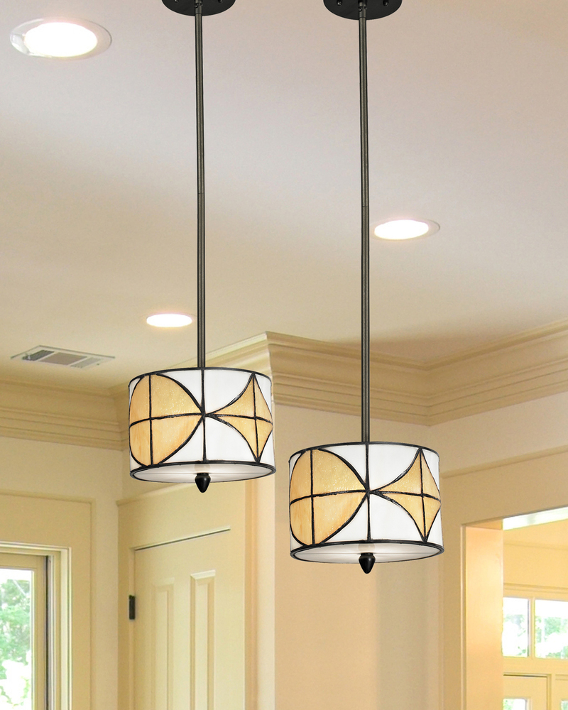 Good things do come in small packages. Our Varesa mini pendant packs a lot of power in its modest size. The circular shade’s crisp white background provides a brilliant contrast to an alternating band of bright yellow ovals and triangles. Dark eye-catching filigree between the panels and on the shade’s borders adds sharp detail to the overall design. A 60W bulb (not included) ensures ample warm light. Hung from a sleek metal canopy and support rod, Varesa not only dresses up a bar or kitchen island, but also makes a sensational spotlight over an accent table. Wherever you choose to hang it, Varesa will be an impressive addition to any decor in your home.