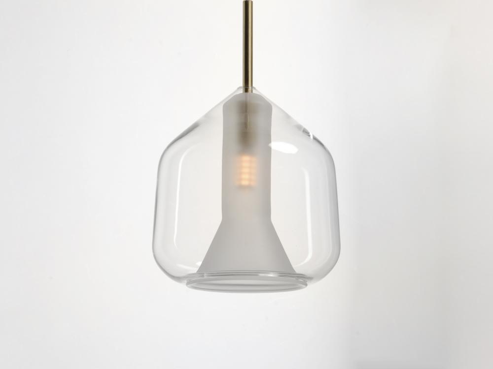 A collection of glass in glass pendants in 3 shapes and 2 finish combinations epitomizes classic contemporary design. Available in either Clear over Frost with Satin Brass accents or Smoke over Frost with Polished Chrome.