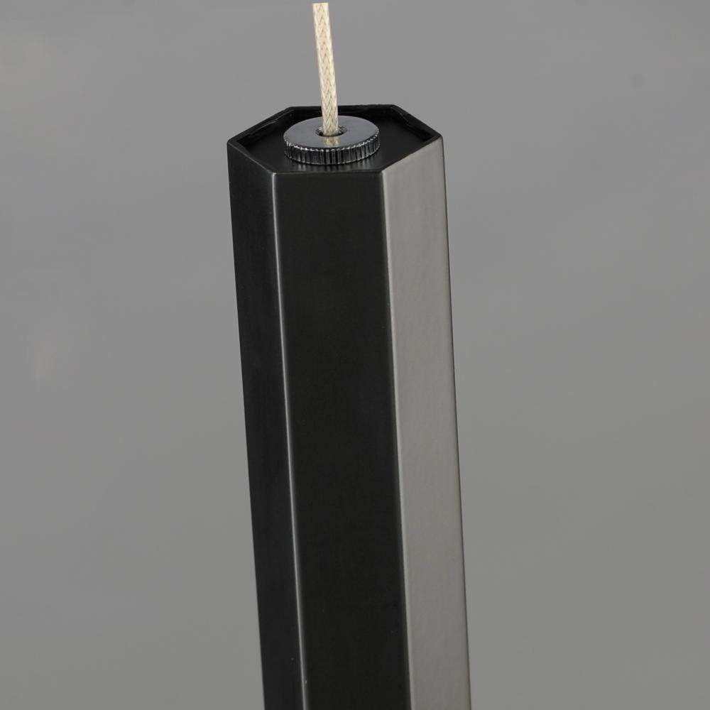 Hexagonal tubes of various lengths support blocks of naturally translucent rock crystal. Each stone varies in diaphaneity making a unique display of refracted light. Available in a plated soft Gold or Matte Black, this luxurious LED pendant light cluster a